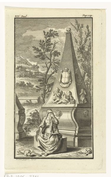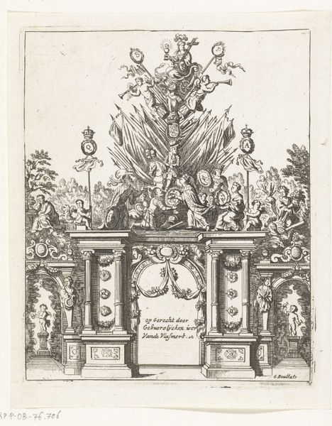 Curator: Alright, let's talk about this remarkable print, "Grafmonument met afbeelding van een bacchanaal" from 1726 by Andries van Buysen the Elder. It’s a feast for the eyes, isn’t it? What strikes you about it? Editor: Absolutely, it’s striking! The intricate details are incredible, considering it's an engraving. I get a sense of, well, solemnity mixed with almost… chaotic energy? Like a party bursting out of a tomb! How do you interpret the, erm, 'festivities' depicted on the monument itself? Curator: Exactly! That tension, that beautiful paradox, is key. It's baroque, so everything's extra! Think of the Bacchanaal – the revelry, the intoxicating frenzy—juxtaposed against the rigid structure of a grave monument, it's genius! It makes me wonder: what better way to commemorate life than to celebrate the raw, ecstatic experiences we're capable of? Are we truly living, my friend, or merely existing within boundaries? The question beckons, doesn't it? Editor: I see what you mean. It’s not just about death, it’s a commentary on how we choose to live—or perhaps how we remember the dead to have lived! The figures almost look like they're dancing their way out of the stone. Curator: They absolutely are! Look at the details! Every swirly line, every ecstatic expression. Buysen asks us to confront mortality, but with a wink and a nudge towards the joys of life, don't you think? So what are your parting thoughts on Buysen's creation? Editor: I had initially only thought of death when I viewed the engraving, but the artist made it clear the message goes far beyond it: to think about our own experiences of life. Thanks for the illuminating perspective!