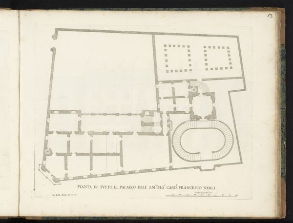 Curator: Here we have Giovanni Battista Falda's "Plattegrond van Palazzo del Quirinale," made after 1655, a detailed architectural print showcasing the Quirinal Palace. Editor: It looks like something a meticulous architect might doodle during a very important but dull meeting – all straight lines and right angles, captured on lovely tea-stained paper. Is it parchment, perhaps? Curator: Actually, it's ink and etching on paper, embodying the Baroque era's aesthetic of grandeur through detailed cityscapes and architectural drawings. Editor: It definitely exudes order, doesn't it? Almost intimidatingly so. I imagine the popes who resided there must have felt watched by those perfectly aligned corridors and chambers. Curator: It served as a papal residence, reflecting the church's power, but it was also about urban planning. Prints like this circulated ideas, standardizing aspects of palace designs and even influencing statecraft. The scale suggests immense planning went into every room and hall. Editor: All I see are potential hiding places during political intrigues. Think of the stories those walls could tell, if only architectural plans came with annotations beyond "throne room" and "ballroom"! Curator: Architectural prints allowed broader audiences to imagine and understand the structures inhabited by their leaders and explore its impact on social life and power dynamics. Editor: But to render such a significant space with so few human elements! Is that the nature of this particular format? What if Falda had peopled the corridors, like tiny Sims, acting out dramas of the era? Curator: Adding human figures would dramatically shift the focus; rather, this gives us access to an understanding of spatial control, access, and proportion and scale. Editor: Still, I find myself yearning for just a touch of the human to remind me that these elaborate rooms weren’t just lines on paper, but were places to forge empires. Curator: It reminds us to delve beneath the surface, questioning what these depictions omit and what narratives of authority they implicitly perpetuate. Editor: Exactly! Perhaps my Sims vision wasn’t so far off—after all, history comes alive through storytelling, both imagined and recorded.
