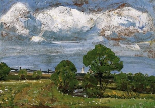 Editor: This is Paul Henry's "Leenane," painted in 1913 with oil on canvas. It’s a captivating landscape, the light seems almost palpable. What do you see in this piece beyond the surface level depiction of a serene landscape? Curator: I see a meditation on labor and landscape. Think about the material reality behind this image: oil paint meticulously applied, likely *en plein air*. It suggests a direct encounter with the land, but one mediated by the artist's own labor. Consider the economic forces at play; who is commissioning and consuming such images, and how does that impact the way the landscape is presented? Editor: That’s a perspective I hadn't fully considered. I was initially focused on the Romantic aesthetic, but thinking about it as labor… interesting! So, what about Henry’s choice to paint outside; how does that material aspect change things? Curator: Crucially, plein air connects the act of painting to the rhythms of the land itself. It embeds the painting within a specific socio-economic and temporal framework. Who owned the land, and how were local populations engaging with that terrain? That also determines the conditions under which Henry makes this work. How are his activities different or similar? What opportunities were made available to him to create in this region? Editor: So, rather than just seeing a pretty landscape, we're really seeing a commentary – maybe unintentional – on class, access, and even colonialism as related to materials and craft? Curator: Precisely. By acknowledging these things, we destabilize traditional notions of “pure” landscape painting. Editor: I’ll never look at landscape paintings the same way again! This perspective really challenges me to go beyond aesthetics and examine the bigger picture, in all its complexity. Curator: And that's the goal – to appreciate the art not just for *what* it shows, but *how* and *why* it was made.