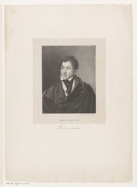 Editor: Here we have Adolphe Mouilleron's "Portret van Gr\u00e9goire Bordillon," dating between 1830 and 1881. It's a lithograph currently held at the Rijksmuseum. I find his sideways glance very intriguing, almost suspicious. What stands out to you in this portrait? Curator: Well, lithography allowed for wider distribution of portraits. Who was Bordillon, and who would have wanted this image? The placement in the Rijksmuseum suggests historical or artistic significance, perhaps documenting a figure from a specific social sphere. Notice the hat he's holding - what does this tell us? Editor: It’s quite formal attire, suggesting wealth or at least a desire to appear respectable. Perhaps he was a public figure, or someone aspiring to be? Curator: Precisely. The realism in the rendering of his face speaks to a burgeoning middle class, keen to see their likeness and status represented and circulated. Lithography enabled this at a lower cost. Do you think this contributed to shifting power dynamics in society at that time? Editor: Definitely! Accessible portraiture empowers broader social participation and discourse. This artwork demonstrates that technological advancements in art impact social structures and identity formation. Curator: Exactly! It shows the interesting interplay of art, technology, and social aspiration. Editor: I hadn't considered lithography as such a democratizing force. Curator: And how public image could be shaped through affordable art forms. Editor: Thanks, this was a really insightful analysis!
