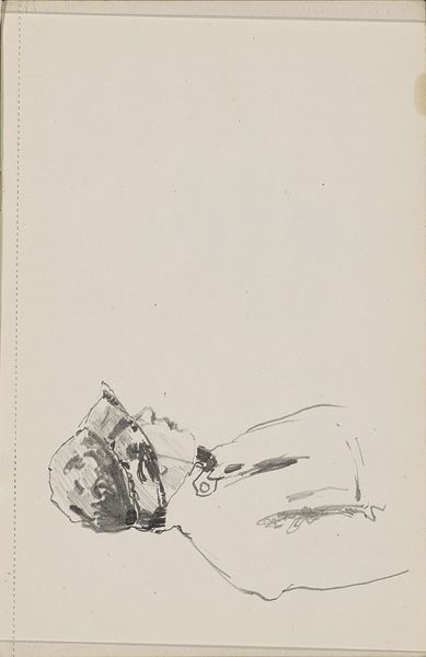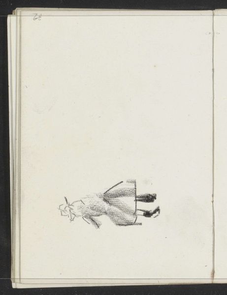 Curator: This drawing is by Willem Witsen, titled "Man met spade, mogelijk een heiwerker," placing it around 1884-1887. It's currently held in the Rijksmuseum. Editor: My first thought is one of stark simplicity, but that somehow elevates this working man’s figure. The light pencil work on the grey page captures him mid-motion. It’s quiet and almost ghostly. Curator: Yes, the ethereal quality is interesting when you consider the symbolism of the spade. A tool of labor, yes, but also connected with land, with ownership, and perhaps the artist is interested in exploring the deeper ties of working folk. Editor: Absolutely. Looking at this from a social perspective, one considers how often laborers were unseen. Witsen acknowledges their backbreaking work and existence within this changing urban landscape during industrial expansion. Is there something about a cultural awareness here? Curator: Precisely. A visual record of a class often ignored, yet foundational to the culture itself. His slightly stooped pose, frozen here on the page, tells so much of repetitive work cycles—this symbol becomes charged. I would further suggest the artist attempts to render the symbol, not just the sitter. Editor: You're right. Even this drawing itself challenges ideas of high art, which often prioritized the leisure class in portraiture. It becomes an early assertion that ordinary people also matter as worthy subjects of art, prompting viewers to examine class hierarchies. Curator: Moreover, by emphasizing an element so associated with creation, that simple spade implies themes of struggle and accomplishment across societal and perhaps spiritual strata. It moves beyond realism into something larger. Editor: Right—the ambiguity around this working figure opens up multiple readings concerning exploitation and identity at this crucial point in industrial history, and prompts an inquiry regarding social equity then and now. Curator: And while modest in scale, it represents significant visual language around manual workers during rapid Dutch urban development. This figure, as a symbol, would linger long after the era faded. Editor: So much can emerge when looking beyond initial impressions and into the deeper historical narratives. Thank you for making this sketch come alive with all of these cultural dimensions!