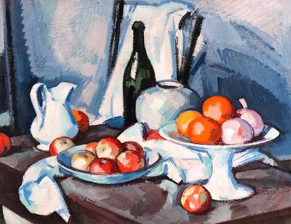 Curator: This is Henri Matisse’s "Still Life with Oranges," painted in 1898. The medium is oil on canvas, and it resides in a private collection. Editor: My immediate impression is… rustic abundance. There's almost a breathless quality, like the fruits have just been plucked and placed with everything else in haste. It's cozy, you know? Curator: Cozy, that’s interesting. In still life traditions, fruit often represents vanitas, the fleeting nature of life. Are the oranges ripe or on the verge of spoiling? Are these vessels about to be drained of their contents? Editor: I feel that too, it isn't fully light, even with that vivid orange! Maybe the coziness comes from it accepting shadow and impermanence. A generous table accepts rot as part of life! Curator: Matisse’s use of impasto adds to the vibrancy but also introduces that feeling of movement, or fleetingness, as you mentioned. Thick brushstrokes capture light differently than smooth surfaces, it brings about such dynamism. It reflects the influences of Impressionism as you see here. Editor: You’re right, it’s like he’s chasing the moment. It’s funny, thinking of Matisse as chasing anything, as a young guy wrestling with Impressionism, though! And all these verticals in bottles and containers. He just needs one splash of color for the fruit! Curator: Note how these vertical objects—bottles and pitcher—rise from the composition and hold and display their individual history through recognizable form. Whereas the table of earthly delights, a temporary stage, shows no restraint. It has no structure! It reflects something psychological, don’t you think? Editor: Yes, perhaps those reaching up forms contrast so the other is fully itself! All oranges! It feels...grounded. You’re also hinting it can have symbolic weight on different levels? From tradition up to personal intention. Curator: Indeed. Now when I look at "Still Life with Oranges" I recognize so much of art history's layers present in its visual motifs. Editor: And I think now, it reminds me to just make room for abundance, to embrace a little lovely chaos like that table top, in the meantime of individual journeys upwards, perhaps!