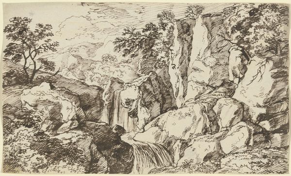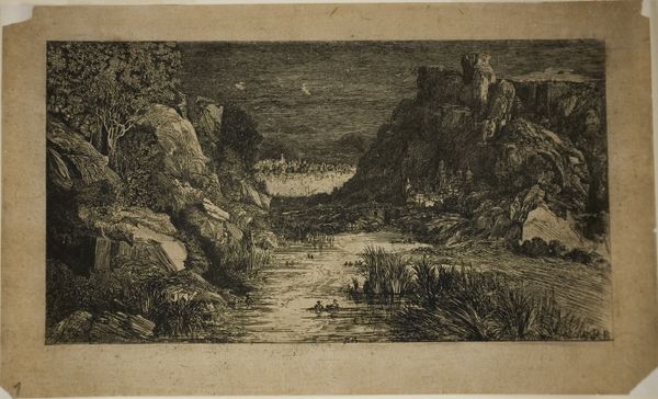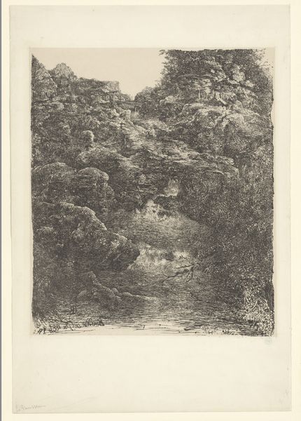 Rodolphe Bresdin created this print, titled "The Stream in the Gorge," in 19th-century France, capturing a landscape rendered with meticulous detail. Bresdin's fantastical vision departs from the Realist landscapes favored at the time, instead evoking a deeply personal world. The Romantic era had waned, but its echoes resonate here, particularly in the sublime quality of nature. Yet, there’s an almost claustrophobic density to the foliage, a sense of nature overwhelming the scene. This could be read in contrast to the rapid industrialization in France at the time. As cities grew and rural life changed, artists grappled with the place of nature in a modernizing world. Bresdin, however, seems to imagine nature as both powerful and encroaching. To understand Bresdin's work more fully, we can delve into historical archives, exhibition records, and critical responses of the time. By situating art within its historical context, we gain insight into the social and cultural dialogues it engages.