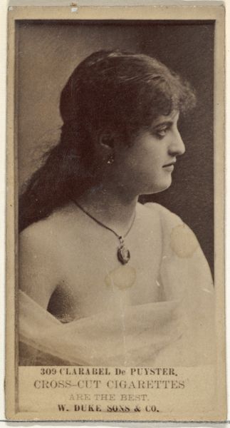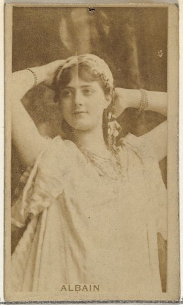 Editor: Here we have an 1890 print titled "Julia Neilson" from the Actresses series, published by Kinney Brothers. The image, used to promote Sweet Caporal Cigarettes, has a dreamy quality to it, and its sepia tone lends a nostalgic feeling. What symbols do you see at play in this portrait? Curator: What strikes me is how this portrait captures a shifting cultural landscape. Neilson, the actress, isn’t just a performer; she's an archetype. Notice how the photograph employs soft focus and romantic lighting. The actress as muse, bathed in a kind of idealized glow, becomes almost saintly. It’s selling cigarettes, yes, but it's also selling an aspiration – a connection to beauty, talent, and even a certain rebellious spirit. Do you think it challenges or reinforces societal norms? Editor: I hadn't thought of the aspirational aspect of it, just the surface-level marketing. Perhaps, subtly, it was expanding ideas of female identity. Curator: Exactly! Consider the Art Nouveau influences—the flowing lines of her hair, the delicate rendering, it speaks to a yearning for beauty and escape from industrial monotony. The cigarette becomes associated with this aesthetic experience. It also taps into a history of portraiture—consider Botticelli’s figures. Even the averted gaze invites a contemplative mood. The photo implies qualities beyond just commercialism. Editor: So, the portrait acts almost like a cultural mirror, reflecting not just Julia Neilson but also the evolving desires and dreams of the time. Curator: Precisely. Visual symbols act as containers of our collective cultural memory. Seeing this now, we recognize not only the brand and Julia Neilson as a popular personality, but our values and dreams of a past society, immortalized within a very ordinary object. Editor: That’s fascinating – seeing an image that captures a society’s hopes and aspirations within what seems like a simple advertisement. Thanks for sharing this cultural perspective!