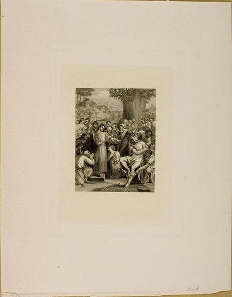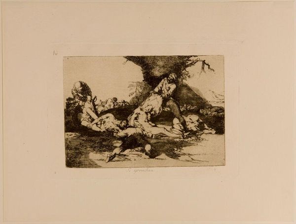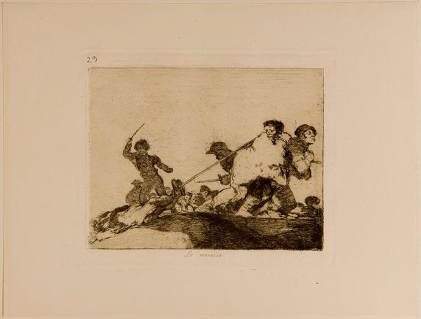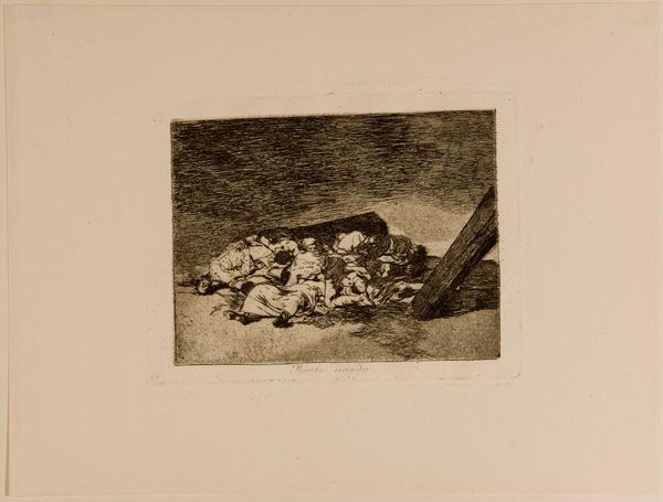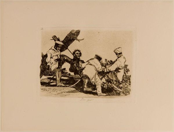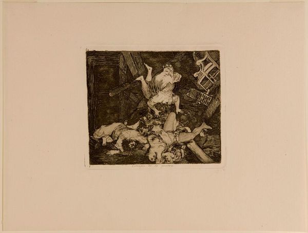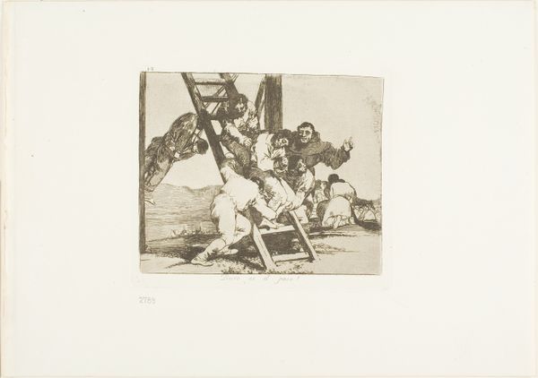 Curator: This is Francisco Goya’s print, "It is a Hard Step!", held here at the Harvard Art Museums. Editor: What a chaotic composition! The figures tumbling from the ladder create a real sense of imbalance and precariousness. Curator: It’s believed that Goya intended this image to represent the corruption and incompetence of the Spanish aristocracy. Editor: The ladder is fascinating; it creates strong diagonal lines, almost bisecting the composition. I wonder if it symbolizes social mobility or perhaps, its failure? Curator: Indeed. Goya frequently used his art to critique the social and political issues of his time, and this is a powerful example. Editor: Absolutely, the stark contrast between light and shadow only amplifies the feeling of turmoil and unease. It leaves quite an impression.