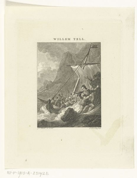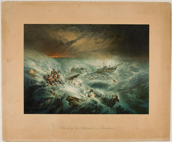 Curator: This is a print titled "Verdrinkingsdood van prins Johan Willem Friso, 1711," or "The Drowning Death of Prince Johan Willem Friso, 1711". It was created anonymously between 1853 and 1855, and it is currently held at the Rijksmuseum. Editor: My immediate impression is of chaos and romantic tragedy. The churn of the sea and the distressed figures convey a sense of overwhelming powerlessness against nature. Curator: Absolutely. The image clearly belongs to the Romantic tradition, evoking themes of grand historical events, here the dramatic demise of a member of the Dutch royal family in the early 18th century. The setting, presumably near Moerdijk as per the inscription, highlights the role of geography in shaping dynastic histories. Editor: Looking closer, the detail in the waves and the rendering of the figures speaks volumes. I am particularly drawn to how the waves and figures interact. We see a distinct labor division reflected here: artisans creating the tools—shipbuilders, horse carriage workers—against nature. It’s almost a case study in the limits of craftsmanship and engineering. Curator: A fascinating point, emphasizing material failure in the face of political significance. The print's widespread availability through the Rijksmuseum archive signifies a conscious effort to democratize access to royal history— to keep such figures visible within national memory and moral consciousness. Editor: And there is something so visceral about its materiality too, think about the original labor needed to make that single copper plate for its printing, not for decorative enjoyment, but for narrative, memory. Its reproducibility granted a function beyond any possible artistic virtue. Curator: Indeed. The print transcends pure artistic expression, serving as a vital historical document and a carrier of national identity. Editor: It also emphasizes the often brutal realities behind the veneer of power and privilege that so easily overshadow its actual making, doesn't it? It is what history and materials, taken together, show.