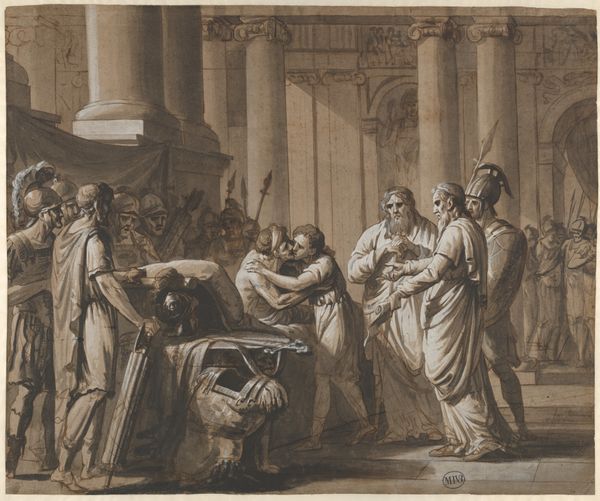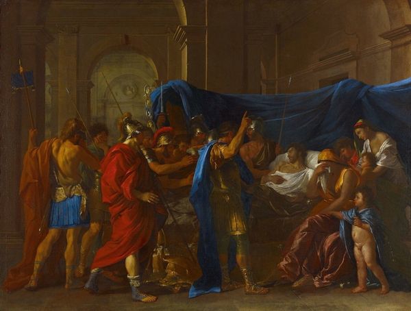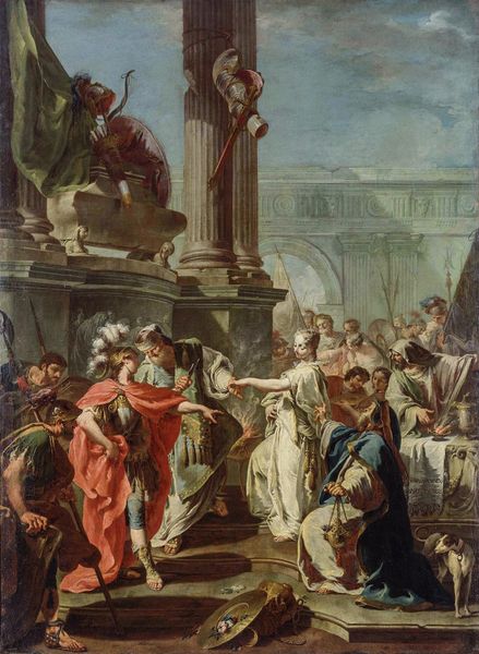 Francesco de Mura painted "Alexander Condemning False Praise" with oil on canvas. The painting's composition is immediately striking, a swirl of figures arranged dynamically around the seated Alexander. Soft pastel hues create a serene yet authoritative atmosphere. De Mura employs color to guide our eye through the scene. The red cloak draped over a standing figure provides a vibrant focal point, contrasting with the muted tones of the architectural backdrop. This dichotomy hints at the painting’s central theme: the tension between genuine merit and superficial acclaim. Alexander's posture, with a laurel wreath placed atop his head, indicates he is in deep thought, questioning the true nature of the praise he receives. De Mura uses neoclassical elements and subtly undermines them, suggesting the instability of power and judgment. The painting encourages us to consider the complexities of truth and illusion in both historical and contemporary contexts.