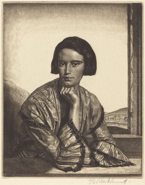 Curator: Here we have Gerald Leslie Brockhurst’s "La Tresse," created in 1926. It's an etching, a printmaking technique that results in fine, detailed lines. Editor: It's strikingly melancholic, isn't it? The way the figure’s draped dress hangs and how her gaze avoids meeting ours...it feels intensely personal. What can you tell me about the process Brockhurst would have used to achieve this tonal effect? Curator: Well, the etching process involves using acid to bite into a metal plate, traditionally copper or zinc. The artist would cover the plate with a waxy, acid-resistant ground and then draw their design into it, exposing the metal. He might have manipulated the depth of the lines to control how the ink takes, affecting the lights and darks, to create an emotionally resonant image such as this one. We might read it through the lens of post-war femininity, perhaps the shifting roles and societal expectations experienced by women after World War One. Her withdrawn gaze feels telling, don't you think? Editor: Absolutely, I'm interested in how those dense blacks around her shoulders, versus the wispy rendering of the braid she’s holding, invite that interpretation. This duality, a somber solidity versus fleeting ethereality...it’s carefully constructed using those material contrasts to create meaning, wouldn’t you say? The contrast of the dark ink with the paper surface underscores this tension so successfully. Also, consider the title; hair has traditionally been considered the pinnacle of a women’s virtue; to showcase that, and also portray this woman in apparent isolation really emphasizes this inner tension, post WWI. Curator: It raises fascinating questions about beauty standards and societal constraints during the interwar period, wouldn't you agree? The gaze avoids ours, perhaps out of self awareness or the weight of what it must have felt like living between two significant wars in such volatile times. Her self-possession, shadowed in these etching methods creates a layered representation of femininity that resists easy categorization. Editor: Definitely. Thinking about it in terms of printmaking and consumption, how would audiences in the 1920s have engaged with an artwork like this, made by way of more ‘mass production’ style production than say, an original oil painting? Did the etching medium help further convey these intersectional ideas on female virtue? Curator: Absolutely, there’s a possibility for democratisation there: this would enable it to have been available to a wider audience than if it had only existed as an original drawing or painting. Ultimately the layered complexity invites a critical reassessment of Brockhurst and the representation of women in his works. Editor: Exactly, the piece pushes us to consider the interplay between the artwork’s material production and the nuanced representation of women at that moment in time.