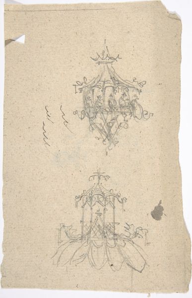 This is a drawing of a mirror with sconces by Thomas Chippendale, made with pen and black ink. The drawing is dominated by an elaborate, symmetrical design for a mirror frame, teeming with floral and foliate motifs. It appears ornate and sophisticated, a feast for the eyes. The overall structure of the frame, combined with its decorative elements, may reflect Chippendale's rococo style, a theatrical, ornate style characterized by asymmetry, scrolling curves, and elaborate ornamentation. The design seems to challenge the rigidity of more classical designs through its emphasis on natural, flowing forms. The frame's structure—a semiotic system in its own right—speaks to the period's fascination with luxury and the display of wealth, reflecting the cultural codes of the time. Chippendale challenges conventional design through his playful integration of natural motifs and asymmetrical elements. The materiality and visual form speak to the fluidity of design. Ultimately, the drawing is a blueprint of artistry that reflects the dynamic interplay between form, function, and cultural expression.