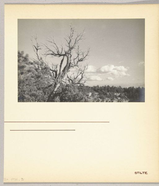 Curator: This is "Landschap in Texas," a gelatin-silver print by Wouter Cool, dating from 1936. Editor: Immediately I’m struck by the scale, the vast flatness contrasting with the dramatic cloudscape. There's almost a desolate beauty to it. Curator: Cool, though not broadly known today, aligned himself with modernist and regionalist movements. Notice how the fence slices across the frame, seemingly an imposed geometry on the wild expanse. What do you read into that, considering the date? Editor: The fence reads very much like a material barrier, perhaps reflecting anxieties about land ownership and the dust bowl era. It bisects what would otherwise be an endless panorama, pointing to issues of access and human impact on this landscape, doesn't it? Silver gelatin was relatively affordable, making photography like this much more accessible. The social context is important. Curator: Precisely. The clouds, rendered almost mythic, evoke a sense of divine or natural power, set against the very earthly, very delineated land. I'm fascinated by how the power lines, however subtle, stand as symbols of progress, or even a forced modernization. They bring to mind manifest destiny. Editor: The flatness also emphasizes a starkness that is accentuated by the medium itself. Gelatin-silver offers such a range of tonal values, highlighting textures that might be lost in color photography. Think about the economics of silver mining, then imagine what went into making a relatively affordable medium for a landscape about ownership. It really emphasizes Cool's engagement with both the place and its people. Curator: And consider the psychological impact of landscape. In times of great hardship, these expansive scenes offer a sense of hope, or the illusion of it, while at the same time symbolizing alienation. Editor: Seeing this today I appreciate how this print encourages a wider view, not only of the landscape, but of art's role in representing that landscape—and the society within it. Curator: A potent blend of visual elements which really distills the experience of observing landscape into the photographic form, capturing an essence that remains powerful to this day.