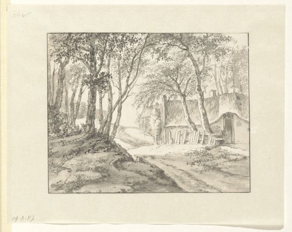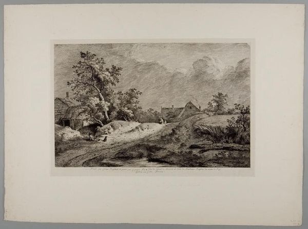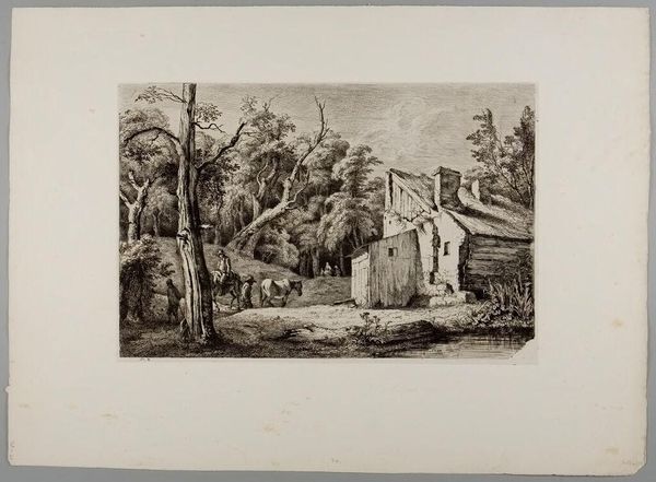 Editor: This is Jean Jacques de Boissieu’s "Entrance to a Forest," and the etching feels like a scene from a fairytale. What symbols jump out at you? Curator: The forest itself is potent. Beyond its obvious nature, the forest is a traditional symbol of the unconscious. Do you see how the riders disappear into the trees? Editor: So, the forest is a space for both journey and loss of self? Curator: Precisely! And the figures near the cottage seem to be enacting some ritual. How do you interpret the figures clustered there? Editor: I hadn't considered ritual. It makes me rethink the piece entirely. Curator: The image certainly invites us to reflect on what we project onto it.