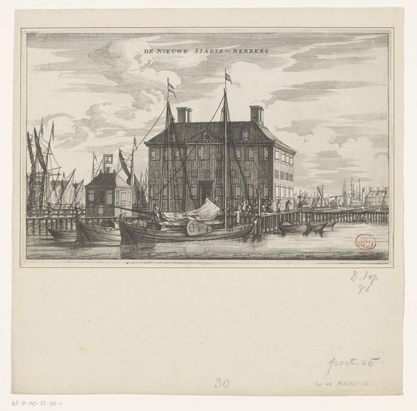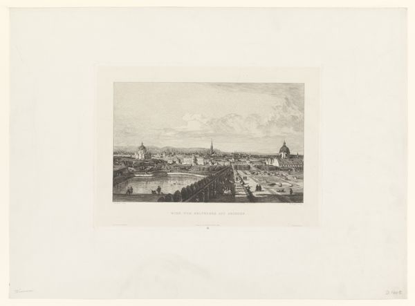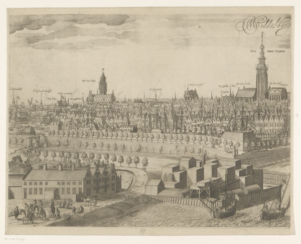 Curator: What strikes me immediately is the intricate detail. The use of line to define form, shadow, and depth—it’s masterful. Editor: Absolutely, it’s a world defined by line, yet devoid of immediate context or explicit narrative. Curator: This etching, entitled "Gezicht te Parijs," offers a perspective of Paris. Created between 1603 and 1650 by Matthäus Merian, the work resides here in the Rijksmuseum. Editor: In the cityscape’s detail, it’s tempting to ignore the figures placed near the foreground on that balcony. They seem disconnected, observing as much as we are. Who do they represent? Curator: Exactly! Those figures are most likely representatives of the privileged merchant class who would have had the money to acquire prints such as this. This image normalizes an assumed relationship between power and viewing. Editor: I notice how the etching technique enables Merian to create sharp contrasts. Light seems to bounce off the architectural surfaces, yet it's still a somber palette. What can that tell us about the symbolism inherent in such a cityscape at that time? Curator: It highlights the disparities of the urban experience: power juxtaposed with vulnerability. Consider, Paris during this era was marked by religious conflict, social unrest, and emerging class consciousness. Editor: And those towering spires—their verticality is so emphasized, as are the rows and rows of repetitive roof tops—speaking to the rising influence of religious institutions, no? Curator: Very much so, indeed. And the architecture speaks volumes about power dynamics during this time. The city emerges through a period of crisis, where urban reform aimed at strengthening governmental and religious authority. Merian is making that visible. Editor: Examining the semiotic encoding here has shown a dialogue between objective cityscape and ideological framework, inviting us to examine whose Paris this actually is. Curator: By shifting focus to those observing merchants in the foreground and away from Paris as a generalized locale of opportunity, Merian reveals something rather critical about that historical moment.