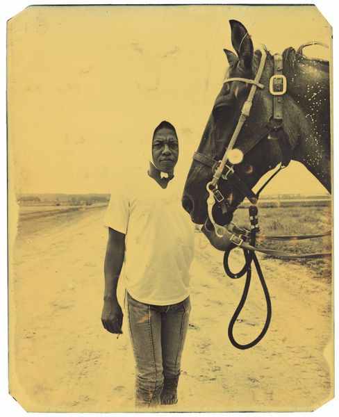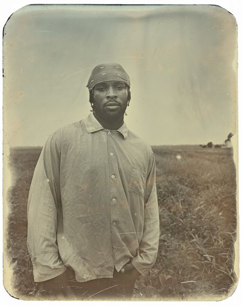 Editor: Deborah Luster created this photograph, “Clarence Henderson, 'Lil' Daddy,' Angola, Louisiana,” between 1997 and 1999. It's a C-print, and there's such an incredible weight in his gaze, standing in the field like that. What strikes you about this piece? Curator: It’s impossible to separate this image from the history of Angola, the Louisiana State Penitentiary. Originally a plantation, it tragically perpetuates a cycle of forced labor, overwhelmingly impacting the African American community. Luster's choice of subject matter, a man burdened with the legacy of this place, challenges the traditional heroic narratives we often find in portraiture. It begs us to confront uncomfortable truths about incarceration and its roots. Do you find that this confronts your own notions? Editor: Absolutely. I was initially just looking at the individual, but framing it in the context of Angola makes you think about the system. The weight of history really lands with so much more force. Curator: The title, "Lil' Daddy," is poignant. Is it affectionate or ironic? Consider the social implications of prison nicknames. Are they stripping humanity or conferring identity within a confined culture? Editor: That’s fascinating! I hadn't thought about the nickname as something created in prison. Curator: Luster's portraits, specifically within this landscape, make us ask what stories remain untold and question who shapes our visual understanding of these spaces. Is this photograph part of the visual imagery shaping policy? Editor: It does seem that highlighting the individual in a photograph opens the discussion beyond policy to actual experience. Curator: Precisely. Art serves as a powerful catalyst for societal introspection, provoking meaningful conversations on deeply entrenched, historical power structures. The photographer has a role here. Editor: I’m seeing now how photographs in a gallery create more awareness by drawing attention to people and systems through stories like these. Thank you.