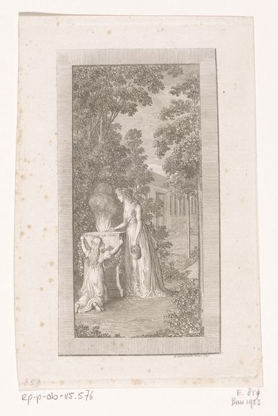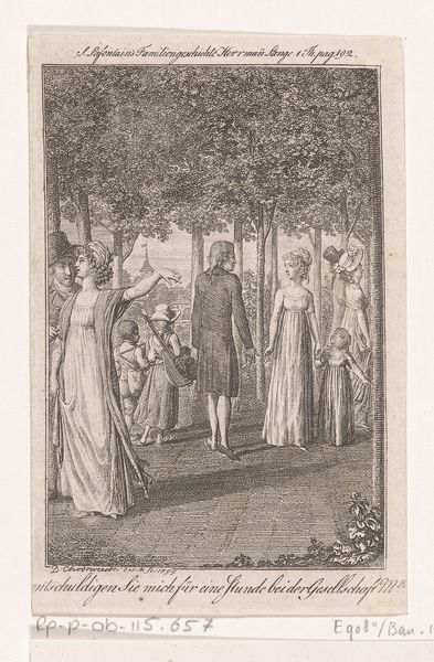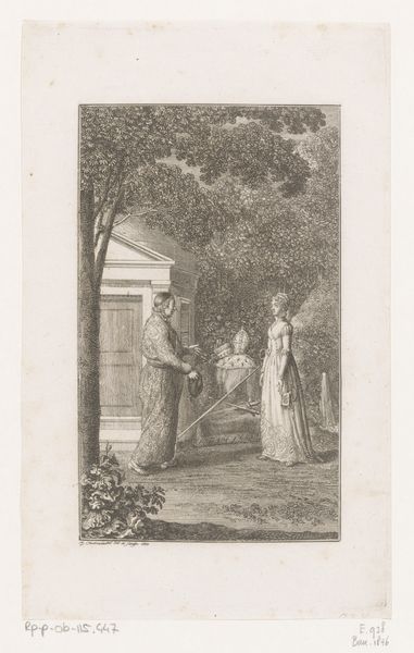 Georg Christian Schule created this illustration of a woman and a man in a park around the late 18th or early 19th century. The scene captures a moment of exchange between a woman, elegantly dressed and holding what appears to be a riding crop, and a man in formal attire. This piece offers a glimpse into the social dynamics of the period, hinting at gender roles and class distinctions through costume and setting. The woman's confident posture challenges traditional representations of women as passive. Her gesture suggests a degree of control or agency, offering something to the man. In Schule’s time, gardens were often stages for social performance, and the encounters within them could be rife with coded meanings. The inscription below, though partially obscured, seems to add a layer of personal narrative, deepening the emotional tenor of the image. While seemingly simple, this illustration invites us to reflect on the complexities of human relationships within the rigid social structures of the time. It is a reminder of how personal interactions are always shaped by the broader cultural landscape.