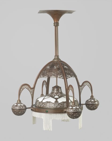 Curator: My eye is immediately drawn to the intricate filigree—a real web of brass catching the light. There's an unexpected lightness to this heavy material. Editor: Indeed! And this brings us to "Eetkamerlamp van koper met een volant van glazen kraaltjes," or Dining Room Lamp made of copper with glass beads, created circa 1914 by Theo Nieuwenhuis. It resides here at the Rijksmuseum. What's striking is how a functional object is elevated into sculpture. Curator: Exactly. Look at how the industrial material of brass is meticulously worked. We're not just talking about function; the artisan, Nieuwenhuis, is showcasing skills associated with jewelry or precious metal work usually reserved for high art. What about its location here at the Rijksmuseum? Editor: That’s fascinating because the presence of decorative arts within the Rijksmuseum says so much about changing attitudes toward design's place in the national narrative. This lamp, originally destined for a dining room, now illuminates aspects of early 20th-century Dutch social history and the rise of Art Nouveau. The beads, do they catch your attention in light? Curator: Absolutely. They serve a function while becoming decorative—acting almost as jewels or adornments. Thinking of the social context in which Nieuwenhuis made it, do you agree the intended setting affects our interpretation? Editor: Unquestionably. The dining room itself held considerable social weight – a space for display and entertaining, a site for negotiating class and taste. So a lamp such as this became not just a source of illumination, but a potent symbol of domestic aspiration. And those aspirations must also have been fueled by broader socio-economic shifts. Curator: This shift certainly fueled the demand for such pieces, didn't it? Now, imagine the artisan, repeating patterns in brass. The tension between standardization and artistic flair really gets my attention, highlighting the labour and skills involved. Editor: I hadn't considered it so deeply until now. Seeing it displayed as high art gives it a unique perspective on the time period, with its display suggesting evolving tastes and priorities. Curator: And hopefully a fresh perspective on what we now perceive as art itself, not to mention on the socio-economic structures that supported the making and consumption of objects such as these. Editor: A point well made. Considering the cultural dynamics it once occupied alongside its presence here today is crucial. It truly highlights the narrative power objects like this have to enrich our understanding.