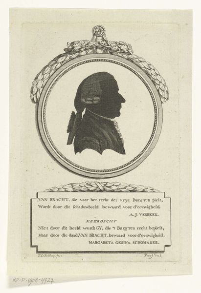 Jan Gerritsz Visser made this silhouette portrait of Willem V, Prince of Orange-Nassau using etching. This image represents more than just a likeness; it reflects the turbulent politics of the Dutch Republic in the late 18th century. Silhouettes, as a popular and affordable form of portraiture, democratized image-making. Willem V, the last Stadtholder, faced increasing criticism for his perceived weakness and autocratic tendencies. Note the inscription beneath the portrait, hinting at the subject's trials, and the artist's pointed commentary on power, virtue, and the struggle against adversity. The inclusion of a laurel wreath conveys the hope that Willem V would be seen as a virtuous leader. To fully grasp this artwork's significance, we need to consider the historical context. Accessing pamphlets, political tracts, and archival records from this period helps us understand the nuanced debates surrounding the House of Orange and their role in Dutch society. Through such research, we can appreciate how art like this etching served as a vehicle for expressing political allegiances.