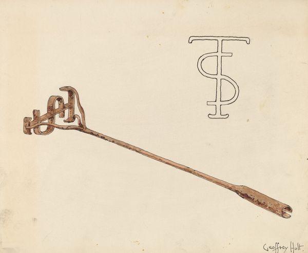 Editor: Here we have "Branding Iron," a watercolor and drawing from around 1942 by Elizabeth Johnson. It's an unusual subject—stark, simple. What historical layers do you think are embedded within this object? Curator: Well, immediately, it brings to mind the historical context of land ownership and cattle ranching, particularly in the American West. The branding iron itself is a symbol of that control, a way of marking property, of asserting dominance. What was the cultural role of the artist, do you imagine, when depicting this kind of implement? Editor: I suppose the artist wanted to highlight this tool and call attention to its central function in shaping the ranching industry? Curator: Precisely. But go deeper – branding also relates to institutionalized property rights. Early branding, if undocumented, would not secure an individual's herd ownership legally, as branding needed to be registered at the county level in places like 1940s Texas. I would want to understand the relationship to power dynamics represented through Johnson's choice to represent a simple 'branding iron' as it's not so simple when one thinks about ownership and who has the right to land. Editor: That is insightful! It encourages you to ponder ownership and regulation rather than simply looking at it literally. Curator: Right. How did gender and power interact, considering the patriarchal culture so common at the time and the woman that was painting it? That, to me, feels most interesting. What stories does the imagery tell? Editor: It provides food for thought. It changes your point of view, makes one ask unexpected questions and look deeper at what you are really seeing. Curator: Indeed, questioning the "who" and "why" is always where it begins for me! Thanks for that observation.