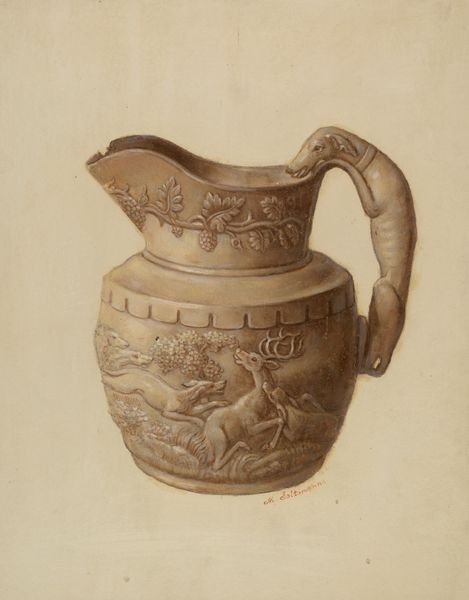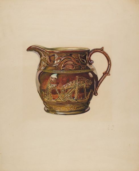 Curator: It has such a rustic charm. I see something comforting and familiar about the color and the shapes depicted on its surface. What can you tell me about this, Yolande? Editor: Certainly. This is a watercolour illustration of a "Pennsylvania German Puzzle Jug," dating from around 1938. Curator: "Puzzle Jug?" I immediately latch onto the floral motifs here: stylized tulips and rosette-like flowers dominating the design, which feel very folk-art inspired. I get this sense of a "tree of life" with abstract leaves around it. How deep do those connections go? Editor: Exactly! The imagery in Pennsylvania German folk art is incredibly important to understanding their cultural traditions. The tulips symbolize faith, love, and hope, very typical motifs in their community's decorative arts tradition. There's something of a utopian vision embedded in this image—an optimism rooted in nature and spiritual symbolism, even down to that sense of grounding coming from the flowing wavy ornamentation at the bottom of the pitcher's vase. The piece seems intended to evoke positive feelings, doesn't it? Curator: Yes! I was right in picking up on the emotional current in the picture. As an object made around 1938, it almost feels as though there’s a conscious need to evoke and retain those values amidst all the uncertainty brewing internationally during that era, preserving older folk customs at the edge of great world change. Editor: That’s quite likely. It’s important to think of Pennsylvania German folk art as a conscious act of community building. They retained so many visual symbols tied to very particular hopes and anxieties during waves of immense social change. And the very fact it's rendered as a "watercolour illustration" of such an object also brings forth the practice of recording objects from this particular community. Curator: I hadn't thought of that, but that rings true! There's this almost scholarly impulse as well. It invites the viewer to look beyond a simple pitcher. What a rich and complicated representation. Thanks for this new look! Editor: My pleasure! These jugs are anything but simple, aren't they? And understanding their purpose expands the history to include more than we might've initially realized.