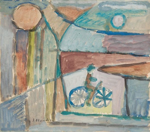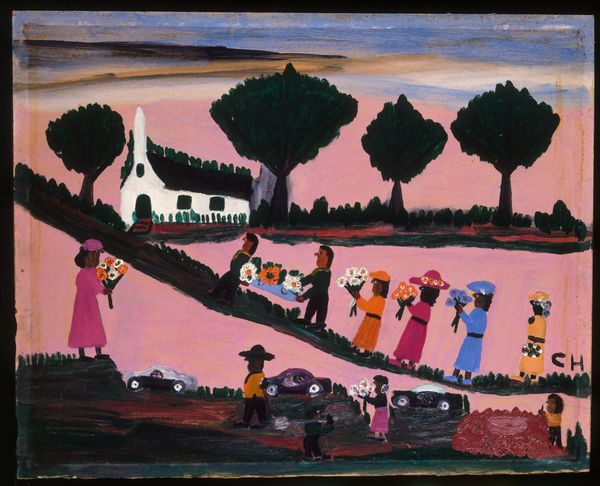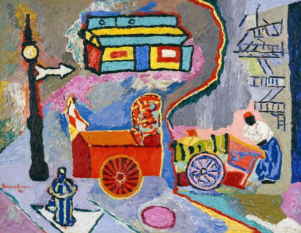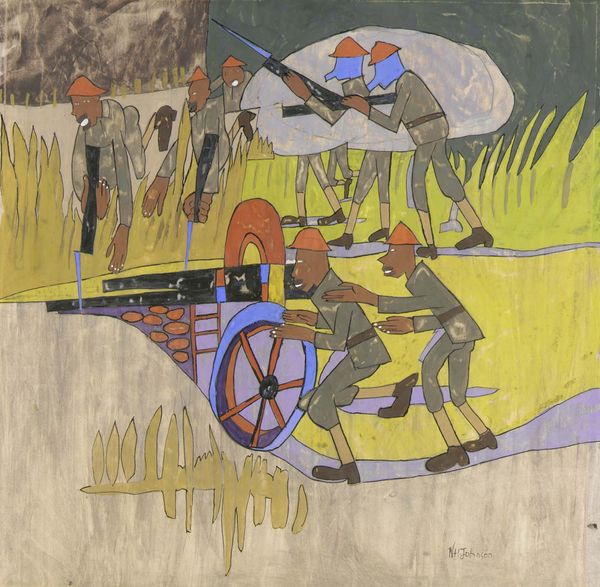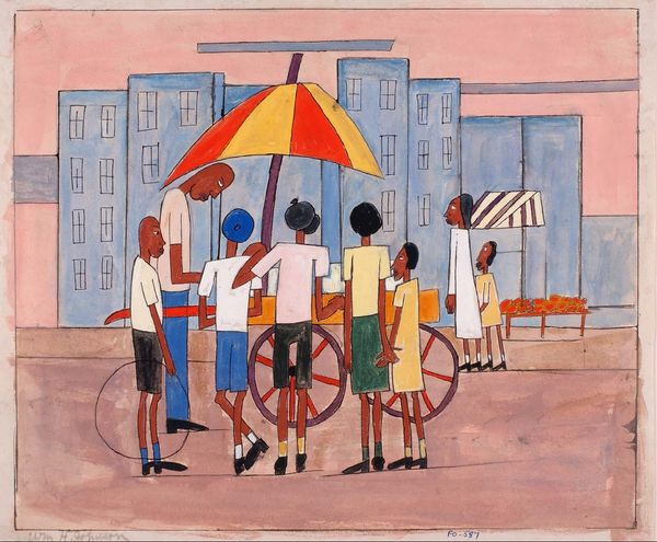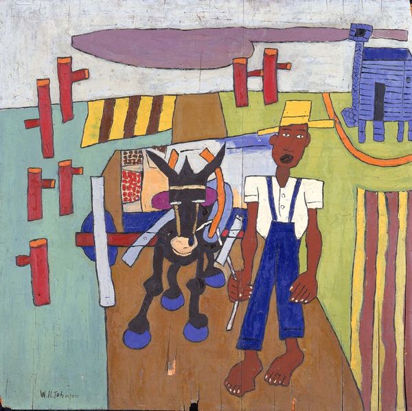 Editor: William H. Johnson's "Breakdown," created in 1941, feels… well, a bit chaotic! There's a strange energy with these somewhat cartoonish figures. The flattened perspective and bold colors add to that intensity. How do you interpret this work? Curator: The symbolism here resonates deeply. Consider the exposed feet beneath the broken-down vehicle. Bare feet often represent vulnerability or being grounded to the earth. Are they trapped? Or is this a deliberate act? Then look at the figure painting a fence, seemingly disconnected. Editor: They seem to be working even as the vehicle they may be reliant on falls apart. Curator: Exactly! Notice too the setting sun. Symbolically, what might a setting sun represent in conjunction with this breakdown and persevering work? Is it the end of an era, a difficult moment, or simply the close of day, the perseverance an act of hope, faith or necessity? This scene holds both a specific story and a larger, perhaps universal, human experience. Johnson offers us entry points to decipher cultural memory, prompting a complex range of interpretations. Editor: It's like he’s using a visual shorthand to express something about resilience in the face of adversity. So it's more than just a breakdown on the road. Curator: Precisely. The figures, rendered in a style evocative of African art, root this scene within a specific cultural context. But it begs further thought. How might lived experience inform his use of archetypal symbols? Editor: This really sheds light on how Johnson infuses everyday scenes with a rich layer of symbolic meaning, and asks the viewer to dig deeper and actively make connections to its universal and cultural subtexts. Curator: Indeed. He's challenging us to look beyond the surface, to find meaning within the breakdown.