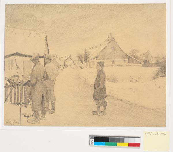 Editor: So here we have "Woman before a House in a Snowy Forest" by Willem Witsen, dated somewhere between 1870 and 1923. It looks like a watercolor painting. There's something so solitary and… melancholic about the scene. What stands out to you? Curator: It has a ghostly touch, doesn't it? The way the bare trees seem to dissolve into the sky, the heavy snow muffling everything. It reminds me of half-forgotten winter memories, like a childhood snow day viewed through a hazy window. It also feels very…Dutch. Those humble, snow-laden cottages – you can almost smell the woodsmoke and feel the biting cold. Have you noticed how the woman almost blends into her environment? Editor: Yes! She almost disappears into that spot of vivid blue amongst all the greys and browns. It’s not a romantic scene. Is it a genre painting, like a slice of life? Curator: Absolutely. But what a slice! Witsen captures that quiet drudgery of everyday life. You wonder what her story is. She could be an emblem of perseverance against the harsh realities of nature, or just a weary figure going about her chores, indifferent to any deeper symbolism we try to project onto her. Perhaps, she’s even invisible to the very landscape she inhabits. That blue of her dress–is it hope? A splash of defiance against the gloom? Or simply the garment she had to wear? What do *you* think it says? Editor: Hmm, maybe all those things at once? I guess I came into this thinking "melancholy," but now I see a kind of…sturdy beauty too. Thanks, I hadn't considered the defiance! Curator: Isn't that the magic of art? To challenge our assumptions, to nudge us towards a slightly different way of seeing. I am glad the “defiance” has sprung into your imagination!