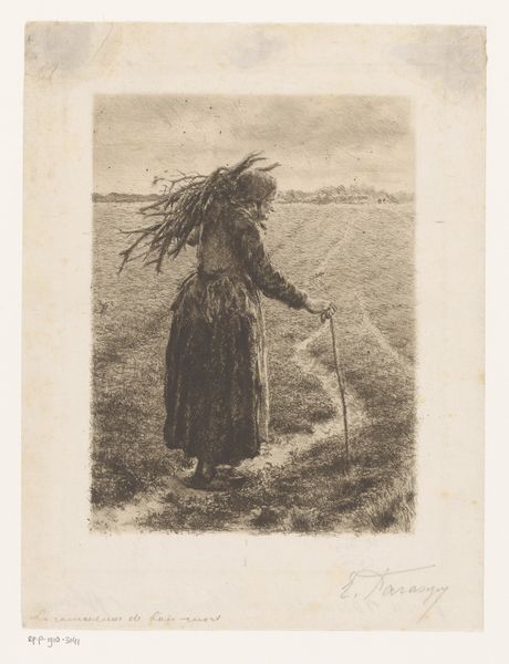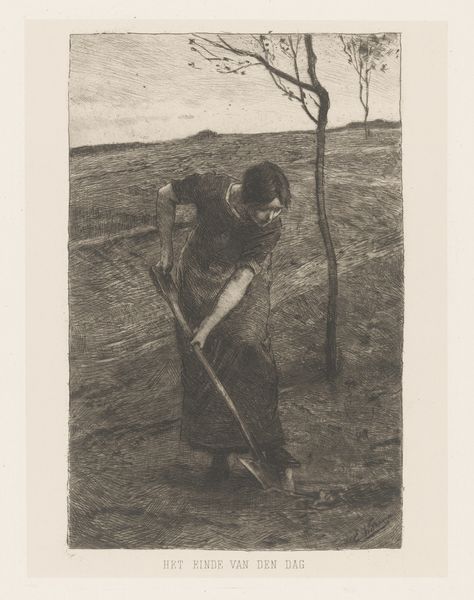 Curator: Willem Witsen's etching, "The Apple Tree," created around 1885, presents a striking image of rural life. Editor: It's certainly dramatic. The dense crosshatching creates a palpable atmosphere, almost claustrophobic despite the open field in the background. Curator: Absolutely. The etching process lends itself to a rich symbolic vocabulary. Here, the apple tree, heavy with fruit, becomes a loaded image. Historically, apples often signify knowledge, temptation, even abundance. Editor: And notice how the figure is placed directly underneath the branches, her hands reaching up as if she's drawing power from the tree itself. Her dress merges into the lower tonal densities of the picture field. We might also focus on the textures: see the rough bark of the tree contrasted against the smooth fabric. The stark dark/light pattern and high contrast create the feeling of a woodcut, very eye-catching to viewers, indeed. Curator: Yes, there’s an undeniable grounding, a sense of being rooted to the land and life in that moment. It connects to a wider cultural memory. The tree is not simply a tree. In many Northern European folk traditions, it is life itself. This woman becomes intrinsically connected to its cycle. Her presence transforms this landscape into more than a setting, it transforms the moment into the universal feminine and the toil associated. Editor: So, less an individual portrait and more of an emblem. I find the visual weighting fascinating. The building anchors one side, balanced precariously by that stark white band of open horizon in the other. I am quite surprised, for a bucolic theme, by how disquieting the final picture feels! Curator: Indeed. What you’ve observed about the visual dynamics, the overall feel of it, reveals much of why this everyday image lingers. There is certainly more beneath the surface of what seems a genre scene at first glance. Editor: It speaks to how formal choices can subtly shift our understanding. It reminds us to consider how each element works independently and in tandem to reveal the deep human dimension beyond mere depiction.