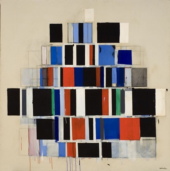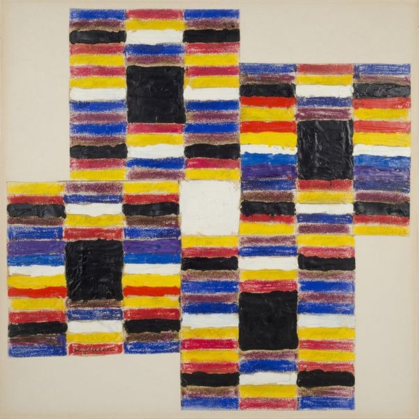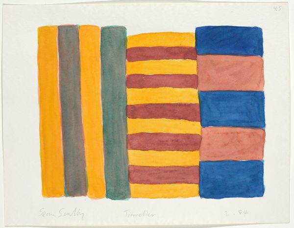 Curator: Sean Scully's "Wall of Light 4.84," created in 1984 using watercolor on paper, presents a compelling study in abstraction. What are your initial thoughts? Editor: Immediately, I'm struck by the solemnity. It evokes a sense of ancient construction, like the remains of something monumental and perhaps religious. The earthy tones and stark geometry contribute to this feeling of austere grandeur. Curator: It's fascinating how these seemingly simple rectangular forms achieve such an emotional depth. Scully is masterfully playing with the grid—a cornerstone of modernist abstraction. Note how the imprecise application of watercolor softens the hard edges. Editor: That interplay between the rigid structure and the fluidity of watercolor is key. I see a kind of tension between order and chaos, the constructed versus the natural. It reminds me of primitive bricklaying, with imperfect joints and variations in material. It invites associations with barriers or boundaries—physical, psychological, even spiritual. Curator: The color choices further reinforce this duality. The dark blacks and browns juxtaposed with the terracotta and blue aren't random. He’s using the emotional properties of colour to expand the language of hard edge painting. Editor: Indeed. Those blues introduce a wistful quality, like a crack in the wall revealing sky. These colors resonate with me, reminding me of ruins uncovered under bright, Mediterranean light. There is also something elemental in the symbolism that is compelling, even if abstract. Curator: Consider too, how the "imperfections," like the visible brushstrokes, reinforce the hand-made quality. The visible process of creation becomes part of the aesthetic experience, making the structural design feel lived-in and tangible. Editor: The "Wall of Light" seems to be evoking a historical or primal sense of building, yet filtered through Scully’s specific painterly vision. Curator: Exactly. We’ve analyzed his deployment of material and technique to explore historical ideas; it invites us to reassess what abstract painting can signify. Editor: Looking closely, I appreciate how an apparent simple composition becomes an active exploration of both time and self.