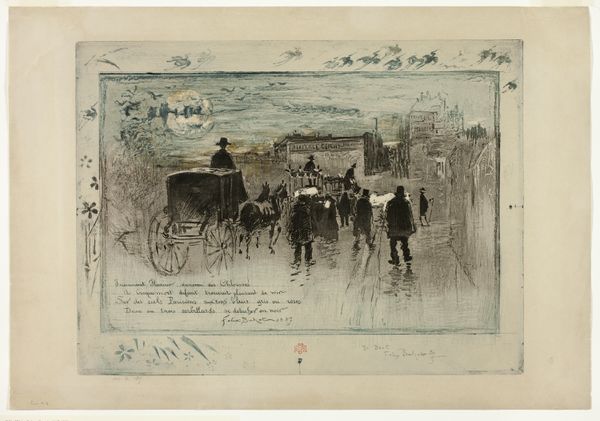 Willem Witsen made this artwork, "Waiting Carriages, London", with brush and ink on paper. The image evokes the social stratification of London at the turn of the 20th century. We see a row of horse-drawn carriages waiting in the rain, presumably for their wealthy passengers. The scene speaks to the opulence enjoyed by some, enabled by the labor of others. Witsen was Dutch, but his choice of subject matter and style reflects a broader European interest in urban life, particularly the gritty realities of industrial cities like London. One could look at the writings of Charles Dickens or the paintings of Gustave Caillebotte to find similar themes. The lack of vibrant color reinforces the somber mood, perhaps a subtle critique of the social inequalities that were part of everyday life. Historians of art and society can use such images as a point of departure for understanding the social dynamics of the time. We can research census data, newspaper articles, and other primary sources to better understand this period and the artist's place within it.