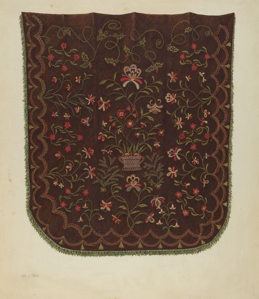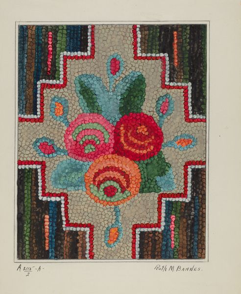 Curator: Let's turn our attention to "Hooked Rug," a watercolor, gouache and graphite on paper work, dating to around 1936. Editor: It’s so vibrant! The overall effect is almost jewel-like—the way the dark greens offset those saturated flower colors feels very deliberate. Curator: Considering the medium, the treatment mimics the texture of an actual hooked rug rather convincingly, doesn't it? What historical or social narratives might it evoke for you? Editor: Instantly, I think of the Arts and Crafts movement and the reclamation of domestic crafts. There's a palpable tension, here, too, between the object's functionality, its domestic sphere, and the ambition to create fine art. It feels like it is questioning those boundaries. Curator: Precisely! Rug hooking, often associated with women's labor and domestic space, speaks to a broader historical narrative concerning the devaluation of women's work. Even the flowers can be viewed as cultural symbols--love, celebration of the home, they could also symbolize ideals of feminine virtue and domesticity prevalent in that era. Editor: The arrangement is fascinating too, very deliberately placed and tightly grouped—perhaps representing more than just beauty. The colours and species perhaps all have significance? Curator: It’s possible. Folk art often draws from deeply personal or community narratives, though decoding these now is speculative. Yet we see decorative arts elevated, carrying messages about gender, class, and access within the art world itself. Editor: I agree; that blend of comfort and something a little deeper continues to resonate with me, like a whisper from another era. Curator: Yes, considering how it positions itself amidst broader dialogues regarding gender and artistic merit allows us to see this artwork beyond its decorative beauty. Editor: Precisely! Thank you for opening my eyes to these narratives. Curator: And you, for helping visualize the potential of everyday art!