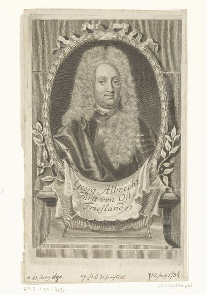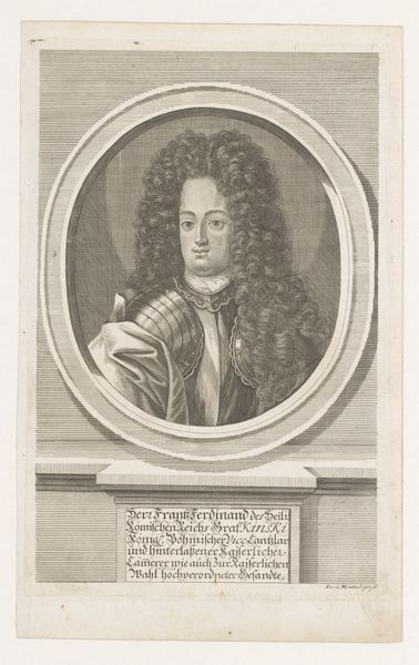 Editor: So, here we have a portrait of Georg Ludwig von Braunschweig-Lüneburg, later King George I, engraved sometime between 1698 and 1714 by Johann Martin Bernigeroth. It has that intricate line work that defines the medium. What's striking to me is how it transforms a political figure into a crafted object. What stands out to you about this piece? Curator: What grabs my attention is the labor embedded in the piece. Engraving at that time was a laborious process. This wasn't just about portraying royalty; it was a production. Think of the engraver's tools, the materials involved – the copperplate, the inks, the paper. This image wasn't merely disseminated, it was manufactured, reproduced for consumption. To what extent did this mode of production solidify or challenge Georg Ludwig's power? Editor: That's fascinating! It reframes my understanding of the portrait. Instead of just seeing it as representation, it's the output of industry. I wonder about the market for these engravings back then. Who was buying them and what did it mean to own such an object? Curator: Exactly! Who was afforded the ability to consume the King's image? Each print represents labor and material that, through this engraving process, are transformed into capital that can further the status of both King and engraver. Also consider how the materials used in art contribute to how we interpret the portrayed figure. Editor: It shifts the focus away from simply admiring the artistic skill to thinking about the means and the messages that are inherent in those materials. Thanks. I'll be looking at art in a new light going forward! Curator: A pleasure. Considering the artwork's raw materiality gives us an alternative look into both our and their time.