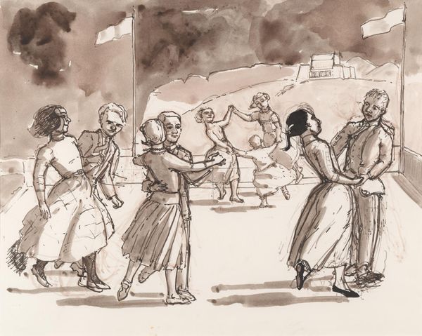 Editor: So, here we have Paula Rego's drawing for 'The Dance,' currently residing in the Tate. It's a flurry of figures in sepia tones, kind of intense. What do you make of it? Curator: It feels like a childhood game seen through a slightly unsettling lens, doesn't it? The swirling figures, the ambiguous setting... Rego often revisits childhood memories, but not always with rose-tinted glasses. Do you sense a tension beneath the surface? Editor: Definitely. There's something almost menacing about the figures. The heavy sky adds to it. Curator: Exactly! The power dynamics at play. Is it a celebration, or something more like a ritual? Rego's genius lies in that ambiguity. Editor: That’s fascinating, I hadn’t considered that. Thanks for opening my eyes to it! Curator: My pleasure! It’s all about finding your own dance within the art, isn't it?