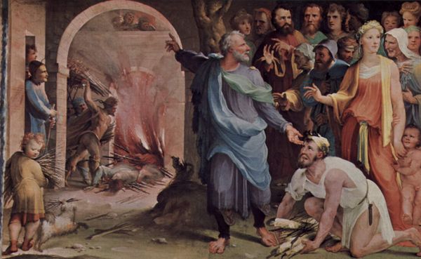 Editor: Right now, we're standing in front of "Entombment," which forms the foot plate of Lorenzo Lotto’s "Altar Polyptych of San Bartolomeo, Bergamo," painted around 1516. It's oil on wood. Looking at this, I'm struck by the almost frantic energy amidst the solemnity. The faces seem strained, the colors… a bit muddied. What's your initial reaction to it? Curator: You know, it *does* have this wonderfully raw emotional current, doesn't it? Like witnessing something too intimate, too soon. I imagine Lotto, ever the sensitive soul, trying to capture that dizzying space between life and…well, not-life. Forget idealized serenity; he offers us a scene vibrating with real grief, wouldn't you agree? The colours enhance this effect, casting it almost like a dream or flashback. And it’s important to remember this isn’t some stand-alone piece. It’s part of a polyptych, informing how we receive the figures, light and expressions. Don't you find it interesting how such raw humanity is on display for such a spiritual occasion? Editor: That's a great point. The faces, now that you mention it, they're not saintly archetypes. They're... individuals. Did Lotto have a particular goal when highlighting emotion and this level of individualized humanity? Curator: I think Lotto was wrestling with the earthly, almost visceral reality of faith, in a time where so much religious art was quite formal, almost untouchable. This humanism—this embrace of feeling—that was truly shaking things up. Almost like a Renaissance Michelangelo. Editor: This perspective brings forward an incredible approach from Lotto to convey a real and honest message. Curator: Yes. We need to come away and ask ourselves, why does death make us, the viewer, so uncomfortable?