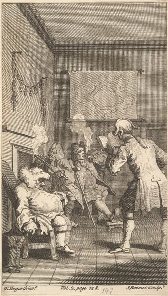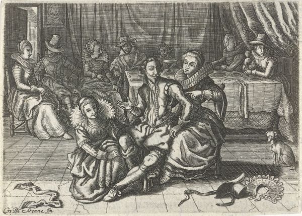 Curator: Welcome. We are looking at "Painter and Female Model in the Studio," an engraving made between 1625 and 1635, attributed to an anonymous artist of the Dutch Golden Age and currently held in the Rijksmuseum. Editor: Wow, immediately I’m struck by this theatrical setup—it feels like stepping into a stage play, everyone so deliberately positioned. So baroque, it’s like a meticulously constructed dollhouse tableau. Curator: Yes, the scene certainly presents a self-conscious staging. This work exists within the conventions of genre painting in the context of the rise of history painting as a popular theme at the time. It reveals interesting social dynamics concerning the artist, his models, and patronage during this era. Editor: I’m loving the almost caricatured figures—particularly that central painter. The self-awareness practically drips off his ruffled collar and inflated breeches! And look at the little dogs bustling about! Pure charm. It's like a sly wink acknowledging its own artifice. Curator: Absolutely, such details showcase the prosperity and social display that became so strongly embedded within Dutch Golden Age society and imagery. It tells of status, wealth, and class distinctions. Notice, too, the interior space. The studio contains the artistic process itself as a display object. Editor: Absolutely. Art about art—or meta-art, centuries before we had that phrase. And do you sense that slightly detached, even haughty gaze of the model? She appears powerful and rather unimpressed—which throws some engaging shadows on that whole male gaze dynamic we so casually ascribe to art history! Curator: Precisely. These considerations about who is performing, for whom, and the negotiations for image construction allow insight into how gender, labor, and art were publicly understood during that time. Editor: Such a wonderful peek into another era! Seeing through both social critique, the personal narrative within this little piece continues to resonate—a reflection on ambition, artifice, and those timeless quirks that render the old masters so beautifully and undeniably human. Curator: Indeed, examining this engraving provides a critical lens into both the representation of artistic practices and social structures of the 17th century, sparking a dialogue on class and creation that still feels strikingly current.
