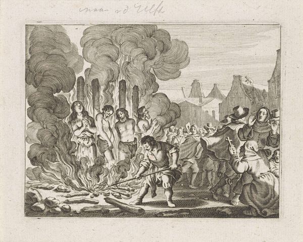 This print, "Kenau Hasselaer op de Haarlemse wallen, 1573," likely made shortly after the event it depicts, uses etching to convey a scene of military conflict. Immediately, the eye is drawn to the foreground, where a group of figures, seemingly led by Kenau Hasselaer, stand defiantly amidst the chaos. Notice how the composition is structured. The artist uses a high horizon line, compressing the space and intensifying the scene. Through the use of line, he creates a sense of depth, leading the eye from the detailed foreground figures to the more sketchily rendered siege in the background. The flags bearing inscriptions act as semiotic markers, signaling resistance and defiance. The strategic deployment of figures and objects—flags, weapons, smoke—constructs a narrative of resistance against oppression. The stark contrast between the detailed foreground and the chaotic background serves to highlight the tension between order and disorder, control and resistance. The print challenges us to consider how historical events are framed and remembered.
