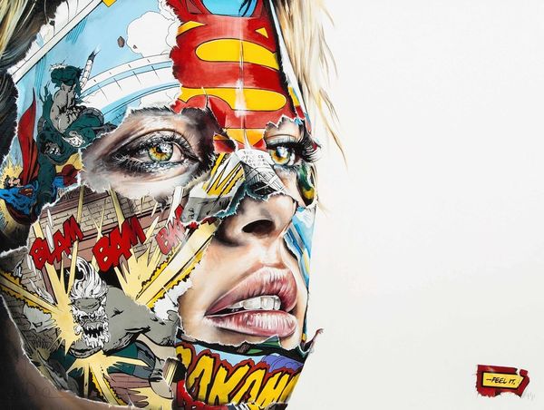 Curator: This striking mixed-media work is "La Cage; et le gouffre de tes yeux," or "The Cage; and the abyss of your eyes," created in 2018 by Sandra Chevrier. It combines portraiture, collage, and acrylic paint. My immediate impression is one of conflict—the vulnerable beauty of the face obscured by these fragmented, aggressive comic book images. Editor: Aggressive is a great word. The title itself suggests confinement and a sense of being overwhelmed. It makes you wonder about the tension between the identity presented and what’s hidden or repressed. Superhero imagery is particularly loaded in this context, isn't it? These comics are masking, not empowering. Curator: Precisely! Chevrier is quite deliberate in her use of iconic figures like Spider-Man and Venom. Superheroes are meant to represent power and freedom, but here, these images appear like shattered cultural symbols, pressing down on the female figure. The "cage" could represent societal expectations, anxieties, or even the internal struggles women face under the male gaze. Editor: Looking at the torn edges of the comic book fragments, I wonder how the history of collage as a disruptive, almost rebellious medium influences the artwork's message. Think of early 20th-century Dada collages. It looks as though, through an aggressive appropriation and repurposing of a typically masculine world of superheroes, Chevrier highlights the fragility and the construction of identity. It also hints to what extent pop-art remains potent within the broader art ecosystem today. Curator: I completely agree. These superimposed cultural images almost create a mask, hiding an inner self. Masks traditionally mediate between worlds or conceal one’s true nature, and Chevrier subtly uses this symbolism in the expressionistic eyes peeking through the collage, conveying vulnerability behind a constructed facade. It’s the eyes that really grab my attention, especially given the title’s reference to "the abyss of your eyes." Editor: They’re strikingly rendered. There is definitely a raw, unflinching emotional intensity. Curator: Chevrier's work really encapsulates how contemporary artists are engaging with potent and often contradictory imagery to examine complex issues of identity and representation. Editor: Ultimately, it serves as a powerful commentary on cultural forces and personal narratives intertwined in our times. Thanks for illuminating its many meanings for me!