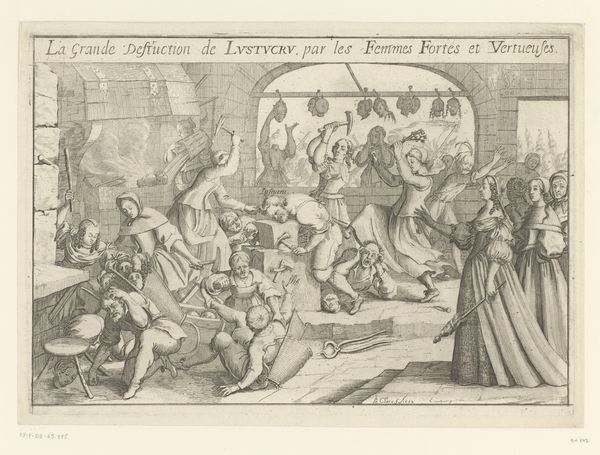 Editor: Here we have Jacques Tortorel's print from 1570, titled "Moord op de protestanten te Cahors, 1561," or "Murder of the Protestants in Cahors, 1561." It’s… well, it's pretty intense. The stark black and white contrasts really amplify the violence, and the composition feels almost claustrophobic with so much happening at once. What catches your eye about this work? Curator: Initially, the intricate linework arrests my attention. Tortorel has meticulously crafted this scene. Note how the density of the lines varies, creating a sense of depth and texture despite the monochromatic palette. Consider also the dynamic arrangement: two distinct tiers separated by the architectural feature, yet united by the escalating action. It leads the eye systematically, doesn’t it? Editor: It does, almost like a graphic novel. So, beyond the aesthetic arrangement, what do you make of these choices, artistically? Curator: The formal choices heighten the impact. The rigid structure of the buildings and walls juxtaposed with the chaotic movement of the figures creates a visual tension. Note how the lines converge and diverge to emphasise specific events, framing areas of intense drama and leading our gaze through a carefully choreographed sequence of violence. The repetition of forms, the angles of weapons and bodies, almost builds into a crescendo, no? Editor: I see what you mean. It’s like the visual language itself reinforces the brutality of the event. So, by emphasizing these compositional choices, you’re steering away from the more overt, historical aspects? Curator: Precisely. While the historical context undeniably informs the work, a formalist reading focuses on the elements of design. The balance of light and shadow, the rhythm of forms, the spatial relationships—these are not merely representational tools, but actively shape the viewer's experience and interpretation. Editor: That's fascinating. I always considered prints from this era primarily for their historical documentation. It is insightful to see how we can decode visual design here to have such significant effect. Curator: Indeed. Examining the formal elements allows us to appreciate Tortorel’s manipulation of line, form, and composition. This provides access to deeper understanding, even centuries removed.