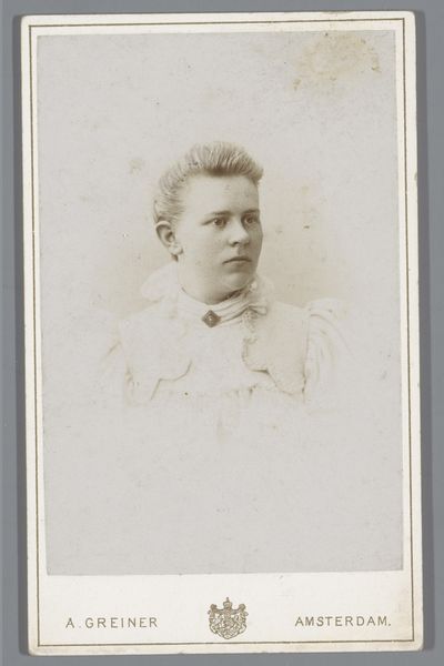 This is a small cabinet card, a 'Studioportret van een jonge vrouw met parelsnoer' – a studio portrait of a young woman with a pearl necklace – by Albert Greiner. The photographic process here is so delicate, it's like painting with light. The tones are muted, almost a whisper of color. Look closely, and you'll see the way the light catches on her face, the soft gradations of tone creating a sense of depth. The pearl necklace is a focal point, a small detail that adds a touch of elegance. It reminds me of the way Morandi would obsess over a simple bottle, finding endless variations in its form. Now, think about the act of posing for a photograph in those days. It was a formal affair, a carefully constructed image. This card is like a tiny window into another world, a glimpse of a young woman from a bygone era. Like a painting, it invites us to slow down and contemplate the details. It makes us wonder about her life, her hopes, and her dreams.