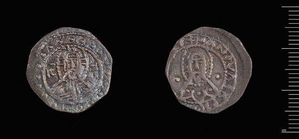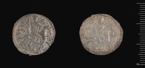 Editor: This is the Stavraton of John VIII, a coin that appears to be made of metal. The details are worn, but I can still discern patterns. What strikes you about this piece? Curator: The arrangement of the figures within the circular frame immediately suggests a highly structured composition. Note the deliberate use of line to create both the figures and the surrounding ornamentation. How does this rigorous design contribute to the coin's functionality as a symbol of power and value? Editor: I see what you mean. The deliberate design does seem to communicate authority. Curator: Indeed. By analyzing the form and structure, we gain insight into its intended purpose beyond mere economic exchange. Editor: That’s a fresh perspective that I didn’t consider at first glance. Thanks!