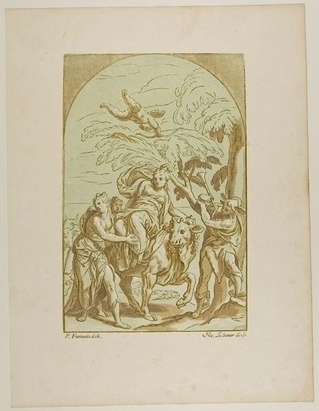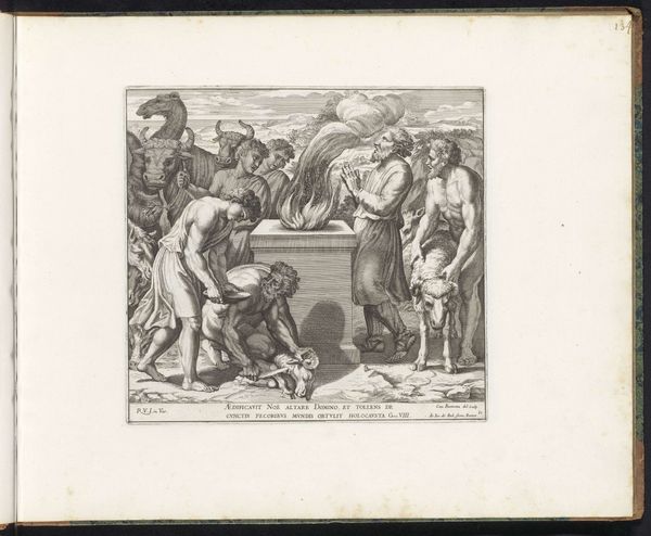 Editor: Here we have Robert Theer's "Triumph of Christ (A-H)." It's a complex scene etched with fine lines, creating a rather dramatic and, dare I say, anxious mood. What's your take on this piece? Curator: Anxious is a great word. Theer seems to wrestle with the weight of salvation. Look how Adam and Eve are almost forced into supplication, and the Ark… well, it's a symbol, heavy both literally and figuratively. I wonder if Theer questioned the cost of such triumph? Editor: The cost? That's interesting. So, it's not just a straightforward celebration? Curator: Never is, is it? Art, life…everything has its price. Theer perhaps hints at the sacrifices, the burdens carried to achieve this "triumph." It makes one think. Editor: I see it now. It's like the image has multiple layers. Thank you.