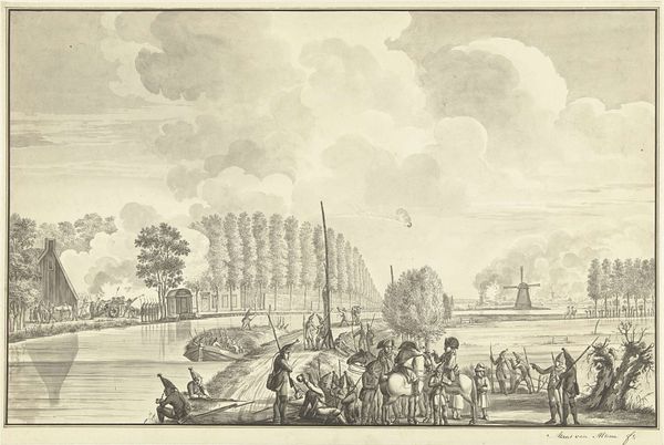 Caspar Jacobsz. Philips created this print, titled 'Departure of the Amsterdammers to Utrecht', in 1787. It is made using etching, a printmaking process dating back to the late Middle Ages. Here, a metal plate, likely copper or zinc, would have been coated in a waxy, acid-resistant substance called 'ground'. The artist then scratched an image into the ground with a pointed tool, exposing the metal beneath. The plate was then immersed in acid, which bit into the exposed lines, creating grooves. Ink was applied into these grooves, the surface wiped clean, and the image transferred to paper under great pressure. Philips was documenting a very specific moment in the history of the Netherlands. This was a period of political turmoil, in which supporters and opponents of the Stadtholder were deeply divided. This image shows citizen militia departing from Amsterdam to Utrecht, to reinstate the Stadtholder William V.