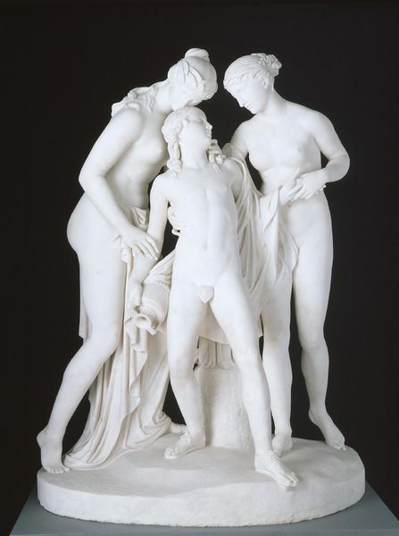 Editor: Here we have Louis Simon Boizot's marble sculpture, "L'Amour piqué par une abeille," from around 1775. It depicts Venus and Cupid, but there's something a little unsettling about it to me. How do you interpret this work? Curator: What strikes me is how this piece encapsulates the complex negotiations of power and vulnerability inherent in the rococo era's representation of love. This isn't just a sweet depiction; it's an allegory for the pains associated with desire, seen through a gendered lens. Consider the societal expectations placed on women during that period. What does Venus's reaction to Cupid's sting tell us about the prescribed emotional roles for women? Editor: That's a good point, it makes me rethink Venus’ role in this narrative beyond just motherly concern. Curator: Exactly. The bee sting, in that sense, functions as a metaphor for the societal stings women experience. Think about it, Cupid isn't being punished; Venus seems to be internalizing and managing his pain. Do you see this piece now as reinforcing or critiquing such dynamics? Editor: I’m starting to see how it could be both. On one hand, it reinforces traditional roles by showing a woman primarily concerned with a male figure’s suffering, even when self-inflicted. But maybe it also reveals the absurdity and injustice of those expectations by exaggerating them. Curator: Precisely! And think about the nude figure – Venus here is literally exposed, mirroring the social vulnerability of women at the time. This exposure, combined with her reflexive empathy, creates a potent commentary on female experience. It's more than meets the eye! Editor: I will never be able to see Classicism in the same light again. This was so insightful; thanks for shedding light on those underlying gendered dynamics!