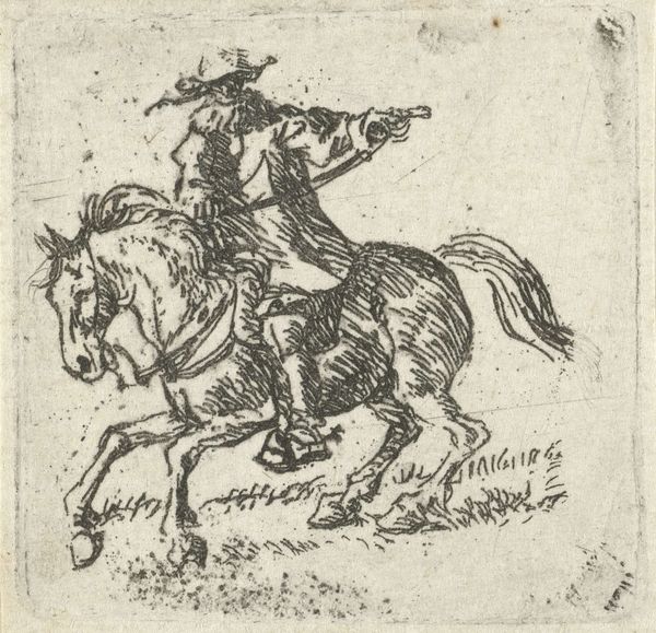 Curator: Well, I must say, this little ink drawing by Johannes Brandenberg dating to somewhere between 1712 and 1730 rather charms me. It’s entitled *Acorn Knave: A Man Astride a Swine*. Editor: My first thought is how small it is, a mere fragment really, yet rendered with such precise lines. I wonder, what sort of paper and ink would have been accessible to Brandenburg, and how that influenced the piece's ultimate form? Curator: Ah, yes, materiality. But consider the figure—a man, quite composed despite his precarious perch atop a wild pig. Above and to the left, a crest bearing the image of an acorn. It reads like a commentary on class and social mobility, perhaps. Editor: Or maybe even the raw materials available to him determined the form? Hog bristles for brushes, perhaps the source for inspiration of the subject! How closely linked are our means and modes of art creation? It's compelling that it uses humble materials for subject and tool. Curator: It certainly speaks to resourcefulness! Still, I'm drawn to the enduring power of certain images—the rider, the banner, even the pig itself. They resonate across centuries, invoking archetypes of power, rebellion, and perhaps, even the absurd. Editor: Perhaps. But consider the labor embedded in its creation; who funded the materials and time needed to execute this, when and where did Brandenburg train, and how all of that factors into not just the image itself, but what the image signifies. This isn't merely iconography. It's the social imprint of an object being constructed. Curator: I appreciate how you anchor this piece within its lived historical context, how raw materials and production intersect with representation. For me, the enduring strength lies in that intersection – seeing the past reflected back through universal motifs and that playful use of allegory, and appreciating what symbols have persisted to hold meaning across generations. Editor: And for me, seeing the constraints and opportunities provided by readily available means of production can illuminate both artistic and social currents more widely.