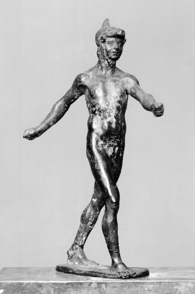 Barthélemy Prieur's bronze statuette, created around 1600, captures a nude male figure poised to draw a sword. The sculpture's dark patina enhances the play of light across the sinuous musculature, inviting a tactile exploration of form. The figure's dynamic contrapposto creates a sense of potential energy, which hints at the influence of classical sculpture. The artist's skill lies in the articulation of the body's surface, where each muscle is rendered with anatomical precision. The contrast between the smooth skin and the textured hair adds visual interest. What does it mean to present an unclothed male? The decision to depict the figure nude, but in a moment of action invites an interpretation beyond mere physicality. The sword represents power, justice, and readiness. It exists as a complex synthesis of form, idea, and cultural context. It invites ongoing interpretation and re-interpretation.