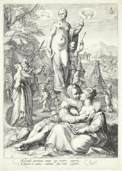 Editor: This is "Juno, Ceres, and Psyche," an engraving by Marco Dente dating back to around 1518. It strikes me as very poised and allegorical; the figures seem caught in a moment of frozen narrative. How do you interpret this work? Curator: This engraving offers a window into the complex social and philosophical landscape of the Italian Renaissance. Dente is drawing from a rich tapestry of classical mythology, but the decision to depict these goddesses—Juno, Ceres, and Psyche—together is fascinating. How do you see these figures in relation to each other? Do they represent distinct facets of the female experience, or a more unified concept? Editor: That's a great point. Psyche is standing semi-nude and appears to be veiling herself, Ceres looks like she is making a plea, and Juno appears to be sitting down on a bird; could this suggest a hierarchy between earthly, personal needs, and higher calling or reason? Curator: Exactly. Now, consider the role of printmaking in the 16th century. Engravings like this weren't just artistic expressions; they were vehicles for disseminating ideas and imagery. Dente is participating in a visual discourse about female power, divinity, and the very nature of beauty at a time when women's roles were rigidly defined. Think about the accessibility of this image – how would it have been viewed differently by different social classes or genders? What tensions do you think that would expose? Editor: It’s incredible to think about the power of a printed image in a world without mass media. Thanks to our discussion, I realize it challenges me to rethink how notions of beauty, divinity, and femininity were constructed and circulated in Renaissance society and today. Curator: Precisely, and by understanding the social and political context, we can better understand not only the artwork itself, but its enduring power and influence on the development of gender studies.