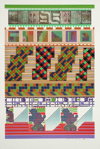 Curator: This is Eduardo Paolozzi’s "Protocol Sentences," a vibrant screenprint housed here at the Tate. I am struck by its almost overwhelming chromatic intensity. It feels like a visual puzzle, doesn’t it? Editor: Absolutely. My immediate sense is one of organized chaos. The rigid grid structure wrestles with these almost cartoonish figures, and the electric color palette seems deliberately unsettling. What's the historical perspective here? Curator: Paolozzi was deeply engaged with the burgeoning digital age. His work explored the impact of mass media, technology, and information overload on society. This piece seems to be playing with the idea of data fragmented and reassembled. Editor: I see that. The pixelated imagery, those geometric forms – they feel like early computer graphics, hinting at the anxieties and possibilities of that technological shift. Like an optimistic warning from the past? Curator: Perhaps. It’s a reflection on how we process and make sense of the world, I think. Each block, each color, representing a fragment of information, combining to make the sentence. Editor: A sentence we are still writing, it seems. A vibrant reminder that chaos and order can co-exist. Curator: Indeed. Food for thought.