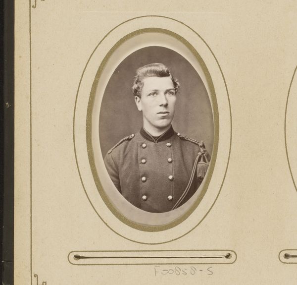 Editor: So, this is "Portret van een jongeman in militair uniform", a gelatin silver print made sometime between 1881 and 1900, created by P. Vlaanderen & C. van der Aa. It's… melancholy, I think. The young man looks so serious. What do you see in it? Curator: I see a captured moment, a little vignette of life carefully placed within an oval frame – a story held in sepia tones, whispering across the years. The uniform, the serious gaze… it’s so controlled, isn’t it? I wonder what he was truly like, this young man playing soldier for the camera? Did he dream of glory or of going home? What kind of dreams do you imagine lived behind those eyes? Editor: I imagine it was quite regimented. Like the military garb boxes him in, and maybe even shapes his expression, and I can’t help but feel sad about that. It feels like romanticism, but restrained, forced into something it’s not. Curator: Precisely! The Romantic era tried so hard to define, refine, everything; they couldn't escape a touch of the baroque! Perhaps he never wanted to be defined at all? Maybe that's the seed of melancholy that you sensed – the fight for individual expression against societal expectation. Do you think the choice of photography, just emerging, helped him express his own story? Editor: That’s a great point. It is such an early photograph. Maybe he was using the novelty of it to exert some control. He can't choose the war, but maybe he can chose his pose, or how much he shows. I'd not thought of it that way. Curator: Exactly! I find these small histories within grand narratives so incredibly compelling, don't you? Editor: Absolutely, thank you! I'm seeing the nuance much more clearly now, it's fantastic.