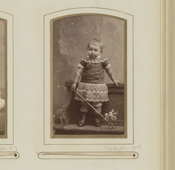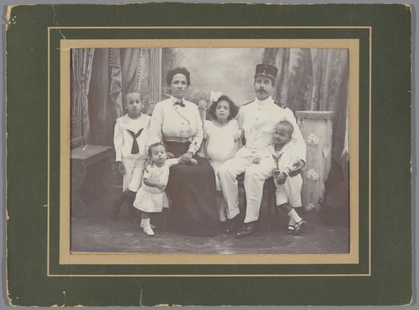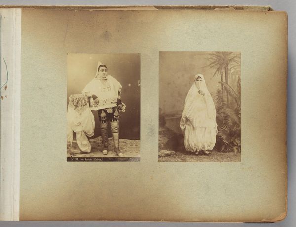 This is an undated photograph by E. Huet titled "Groepsportret van twee mannen en twee vrouwen in kostuum," which translates to a group portrait of two men and two women in costume. The photograph shows a group of four people dressed in elaborate costumes that seem to be a blend of theatrical and everyday attire. The two women are dressed in what seems like domestic servant costumes, while the two men are wearing clown and Pierrot costumes, respectively. In the center sits a man wearing a polka dot clown suit with a pointed hat and large ruffle collar. What is immediately striking is the contrast between the playfulness suggested by the clothing and the relatively somber expressions worn by the group. The photograph suggests a moment of constructed identity, raising questions about performance, role-playing, and the construction of social roles in society. The image might remind us that the costumes we wear and the roles we play are always in conversation with the social expectations of our time.