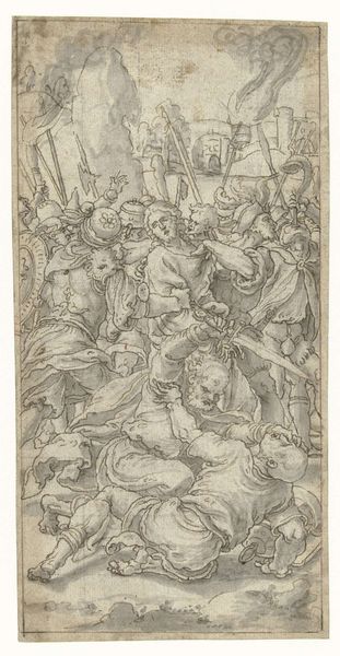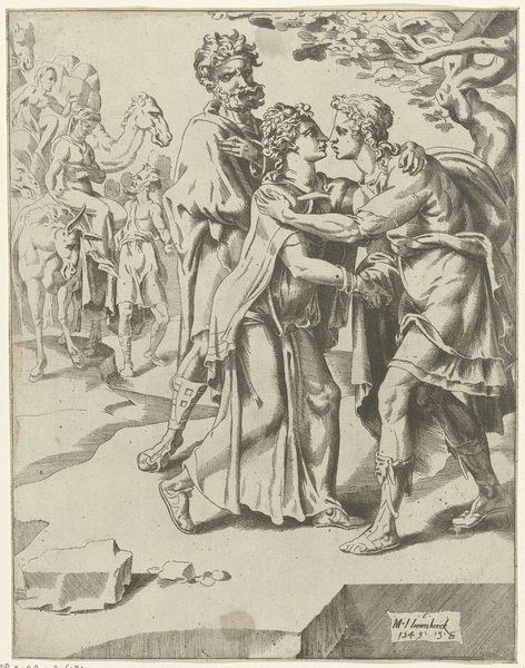 Gerard van Groeningen created this exquisitely detailed print, "Abraham and Melchizedek," around 1563 using engraving techniques. The artwork unfolds as a carefully structured encounter. The composition draws us into a scene of exchange, rich with symbolic implications, as Abraham meets Melchizedek. Notice how the contrast between the figures in armour and those in ecclesiastical robes highlights a tension between secular power and divine authority. Consider the lines defining each figure, creating texture and depth that invites a deeper reading of their roles and intentions. The interplay of light and shadow further enhances the dramatic effect. Van Groeningen uses these formal elements to explore themes of power, faith, and the social order of his time. The detailed rendering and formal structure serve as a commentary on the religious and political landscape, inviting viewers to question the nature of authority and the representation of historical narratives.