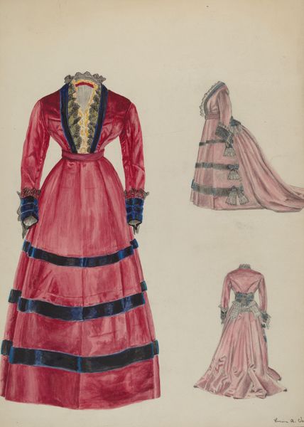 Editor: Here we have "Dress," a pencil drawing from around 1937 by Mary E. Humes. The garment depicted feels very ornate, even fussy, for its time. What stands out to you in this piece? Curator: What strikes me is how this fashion sketch encapsulates tensions within femininity. Notice the hyper-corseted waist juxtaposed with the excessive, almost flamboyant skirt. Can we see this as a representation of women's restricted roles versus their desires for self-expression? Editor: That’s a really interesting reading. I hadn’t thought about it that way. So, the very restrictive shape up top, versus this almost explosion of fabric below. Curator: Exactly. Consider the date, circa 1937. This piece seems to yearn for a pre-war era while standing on the cusp of change. Humes' drawing operates within, and perhaps even questions, established beauty ideals even while the world was undergoing social and political transformation. This invites questions about gender roles and artistic agency during that period, wouldn't you agree? Editor: Absolutely. Looking at it that way, it feels less like a simple dress design and more like a statement about… expectation versus reality for women at that time. Curator: Precisely. The piece transcends the purely decorative. It becomes a coded commentary, one articulated through the very fabric – or rather, the representation of fabric – itself. Editor: That gives me a completely different perspective on what fashion illustration could be. It's not just about clothes; it's about culture and context. Curator: Indeed. And recognizing that expands our understanding of both art and history.