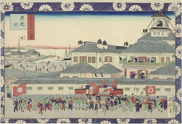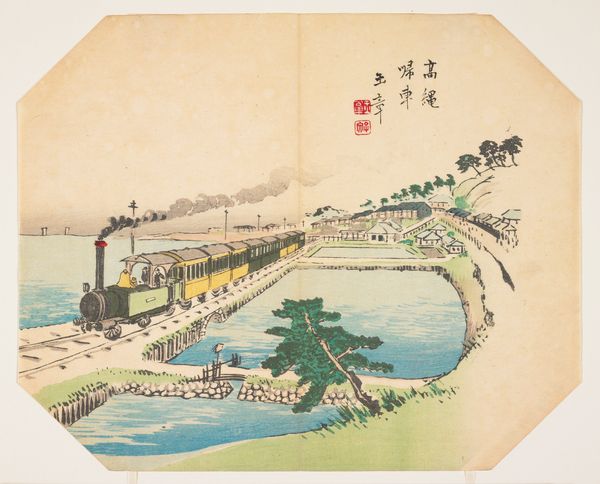 Curator: Here we have a vibrant woodblock print, “Illustration of a Steam Locomotive Running on the Takanawa Railroad in Tokyo” by Utagawa Kuniteru, created sometime between 1863 and 1883. Editor: The naive rendering of this new technology has a kind of charming absurdity. The locomotive is like a colorful toy set against the detailed landscape. I wonder what such imagery meant at this time. Curator: This print offers a glimpse into Japan's rapid modernization during the Meiji period, focusing on the very literal material shift towards industrialization. The Takanawa railroad itself was a powerful symbol of this change. Editor: The steam locomotive immediately struck me as a potent icon, representing both progress and a disruption of traditional Japanese life. Consider the choice of colors: are these historically accurate, or do they function symbolically? Curator: That’s a sharp observation. These vibrant, almost fantastical colors likely reflect the artist’s interpretation, possibly playing into a sense of wonder and novelty surrounding this imported technology. The printmaking process itself – the carving and layering of blocks – speaks to a cultural embrace of industrialized reproduction. Editor: Absolutely. The image carries a complex cultural weight. Note how people in traditional garments and horse carriages fill the scene along with this mechanical beast. It illustrates the way new innovations are often understood through familiar conventions. There’s a bridge there, which acts as a powerful metaphor for connecting old ways to new possibilities. Curator: This triptych form itself deserves attention, referencing traditional modes of presentation while showcasing something radically new. What’s compelling is how Kuniteru uses traditional materials to depict a machine that ultimately changed the nature of labor and distribution in Japan. Editor: It is a captivating image; the contrast of the modern engine set amongst a picturesque vision of rural Japan. You get a feeling that this print encapsulates Japan looking toward the future while holding tight to its cultural past. Curator: I agree. It offers a crucial insight into how traditional artistic practices engaged with and interpreted the rapid societal shifts brought about by industrialization and globalization in Meiji Japan.