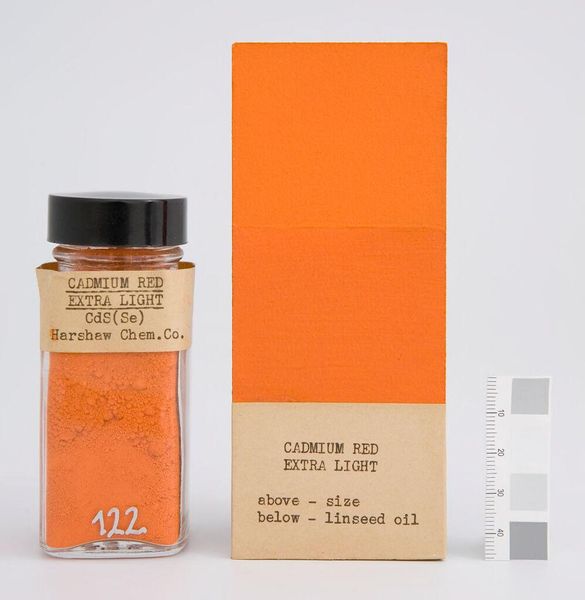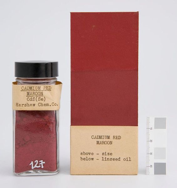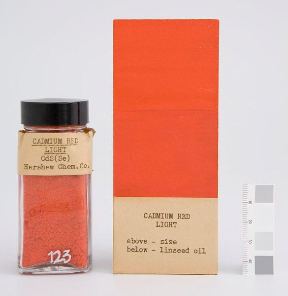 Editor: Here we have "Cadmium Red Deep" by The Harshaw Chemical Company. It's essentially pigment, a jar of vibrant, raw potential. I find it very still and self-contained. What do you see in this piece? Curator: I see a poem waiting to be written. This cadmium red, it's not just color, it's alchemical promise. It's a tiny universe of powdered earth, dreams of Rothko, and forgotten sunsets. How will it bloom, do you think, once it meets its canvas? Editor: That's beautiful! It makes you think of the potential energy in the pigment. Curator: Exactly! And what happens when we unleash it? Magic, hopefully. Or maybe just a really great painting. Either way, it's a conversation starter. Editor: I never thought of it that way. Thanks!